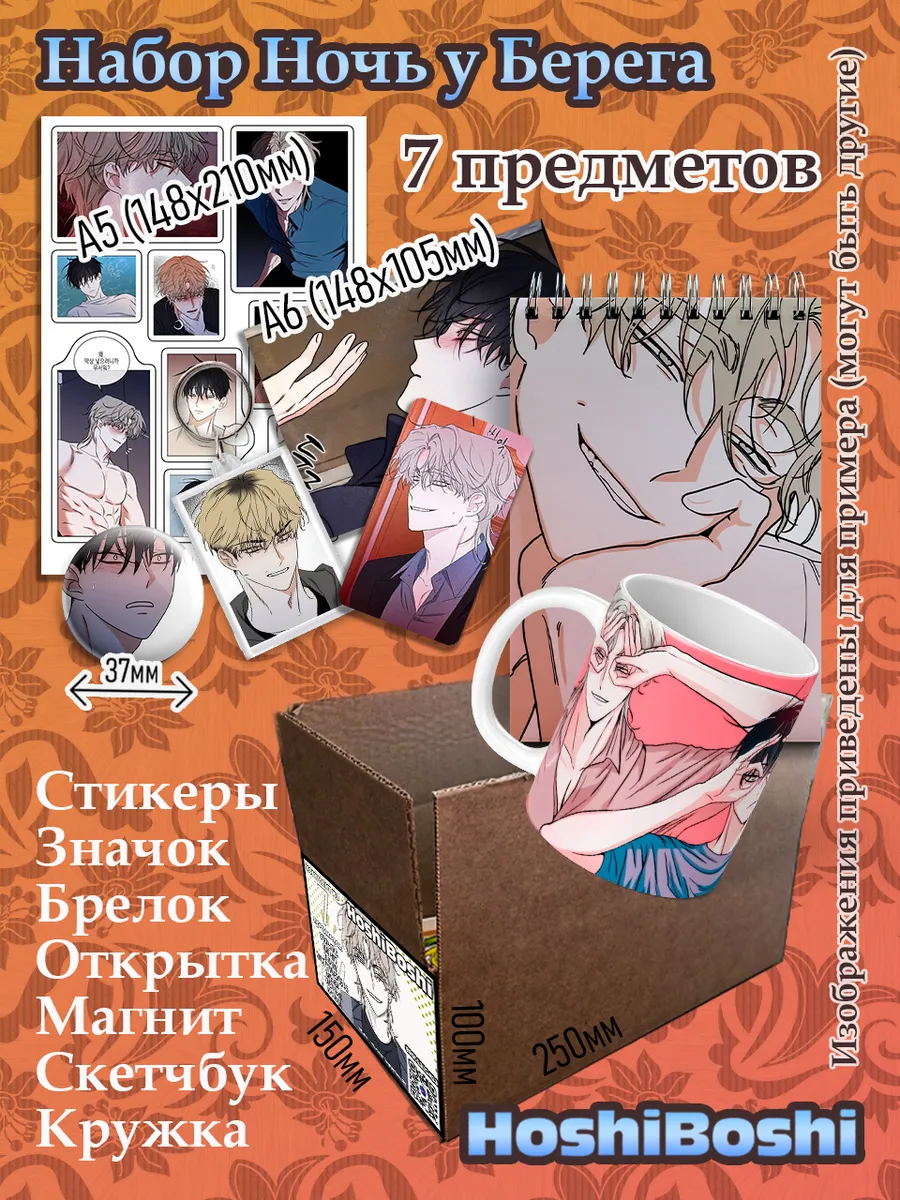 Представляем вам комплект "Ночь у берега" от HoshiBoshi – идеальный подарок для фанатов данной манхвы! Этот набор из 7 предметов станет отличным подарком для ваших близких или для вас самих. Внутри вас ждет настоящий кладезь милых мелочей: стильный значок, брелок, лист с наклейками, открытка, магнит, скетчбук и кружка.