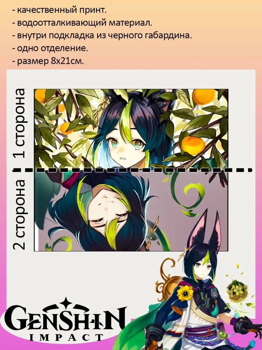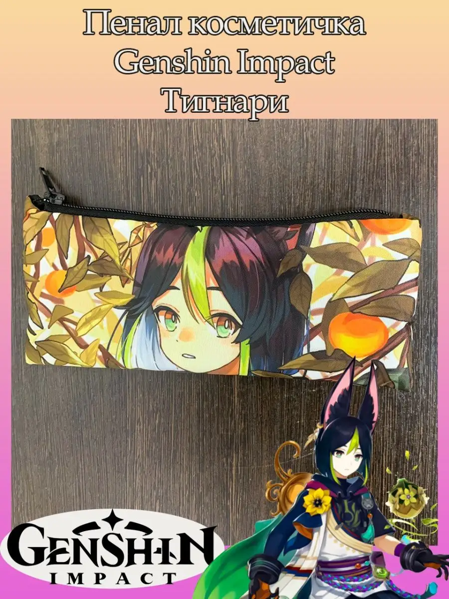 Пенал школьный с большой молнией и с одним вместительным отделением. Изображение из игры Геншин Импакт (Genshin Impact) с персонажем Тигнари. Принт яркий и четкий, устойчивый к выцветанию и стирке.