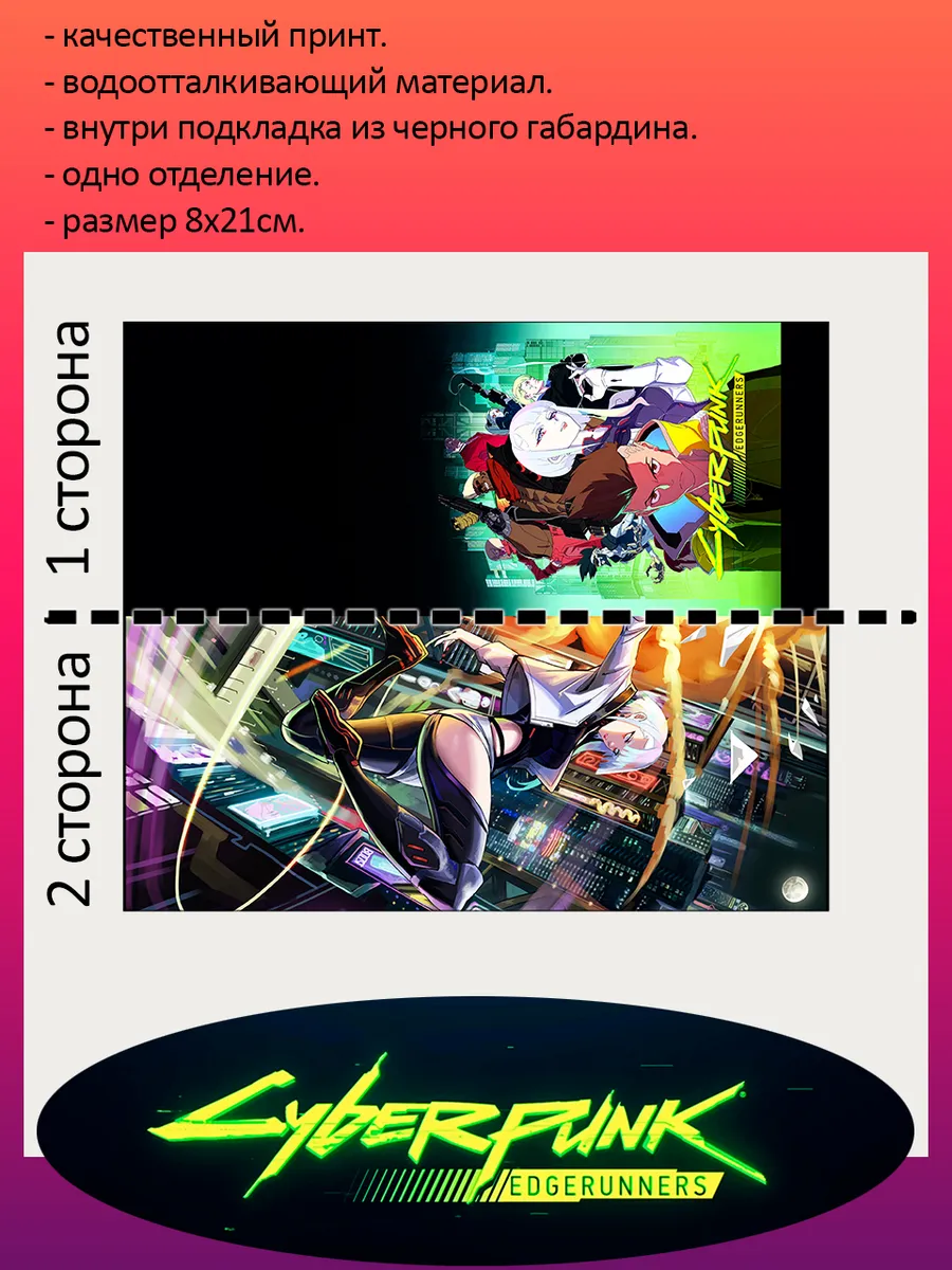 Пенал школьный с большой молнией и с одним вместительным отделением. Изображение из аниме Киберпанк (Cyberpunk 2077). Принт яркий и четкий, устойчивый к выцветанию и стирке.