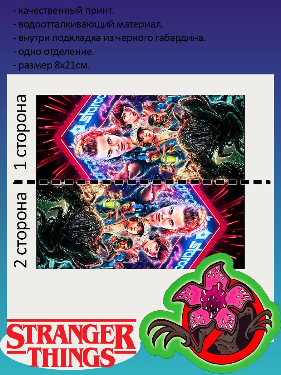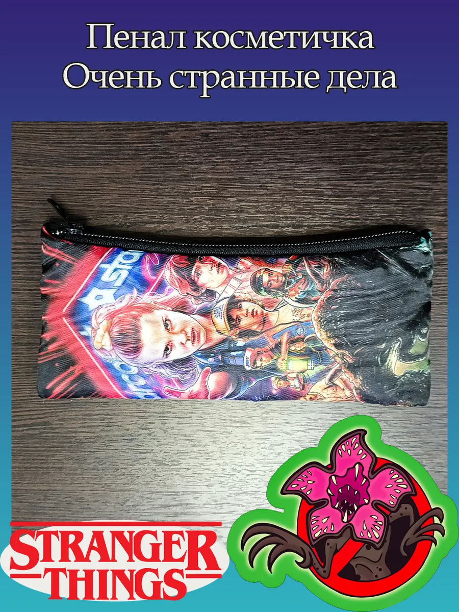 Пенал школьный с большой молнией и с одним вместительным отделением. Изображение из сериала Очень странные дела (Stranger Things). Принт яркий и четкий, устойчивый к выцветанию и стирке.