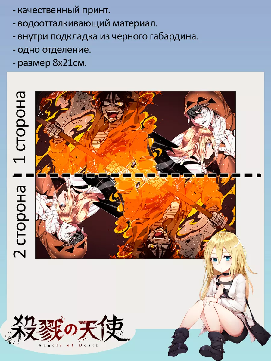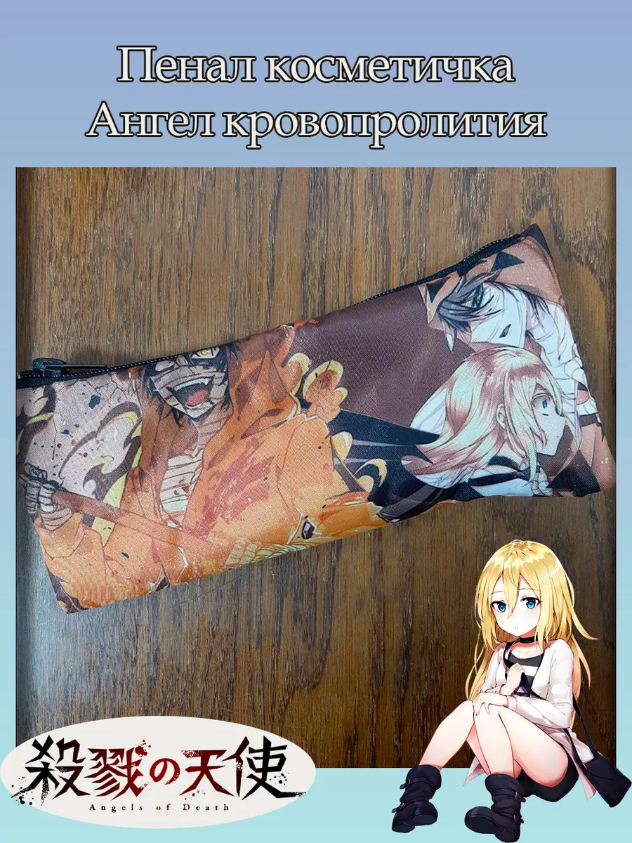 Пенал школьный с большой молнией и с одним вместительным отделением. Изображение из аниме Ангел кровопролития (Satsuriku no Tenshi Angels of Death). Принт яркий и четкий, устойчивый к выцветанию и стирке.