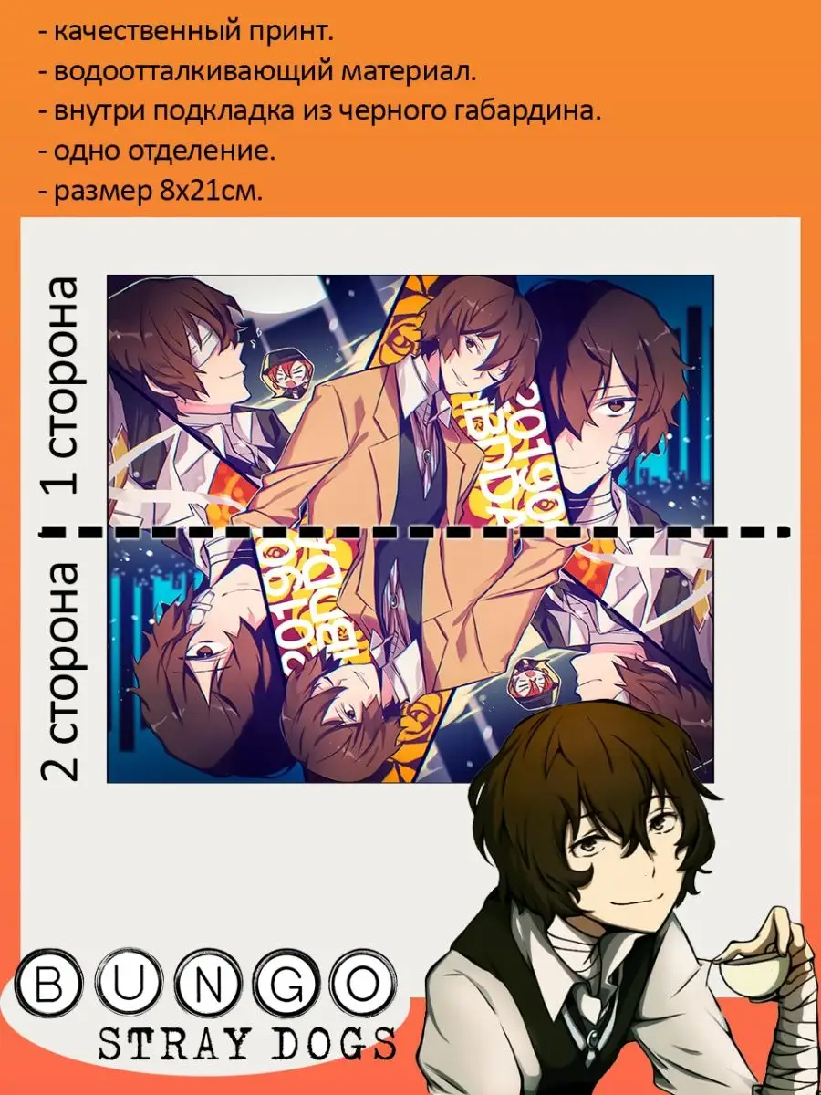 Пенал школьный с большой молнией и с одним вместительным отделением. Изображение из аниме Великий из бродячих псов (Bungou Stray Dogs). Принт яркий и четкий, устойчивый к выцветанию и стирке.