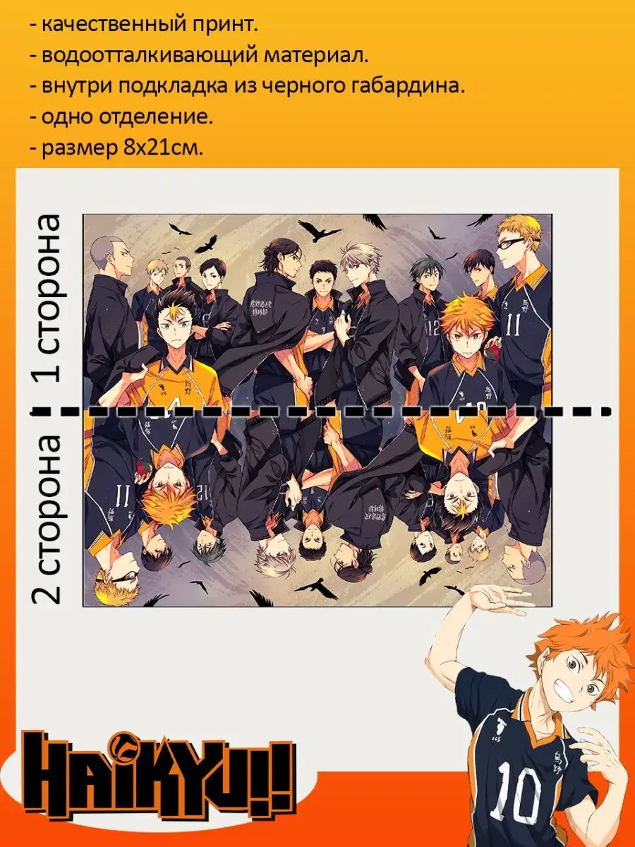 Пенал школьный с большой молнией и с одним вместительным отделением. Изображение из аниме Волейбол (Haikyuu!!). Принт яркий и четкий, устойчивый к выцветанию и стирке.