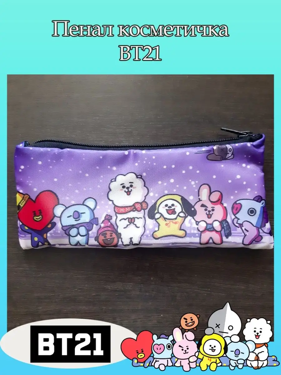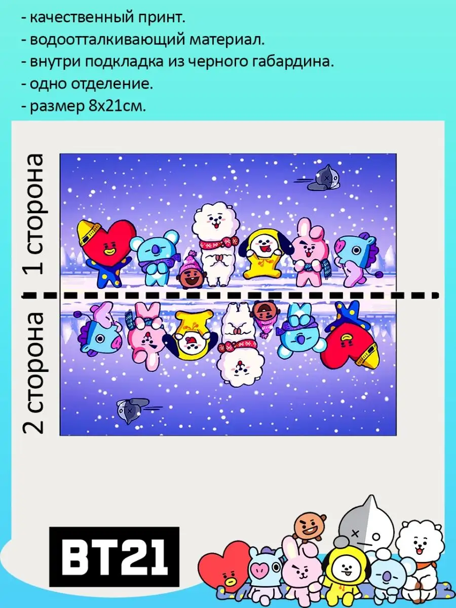 Пенал школьный с большой молнией и с одним вместительным отделением. Изображение с персонажами БТ21 (BT21). Принт яркий и четкий, устойчивый к выцветанию и стирке.