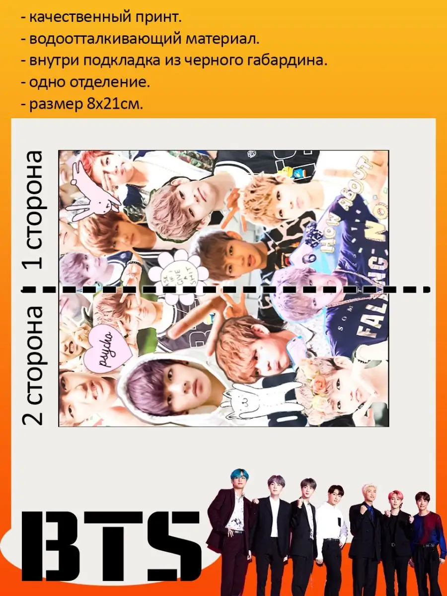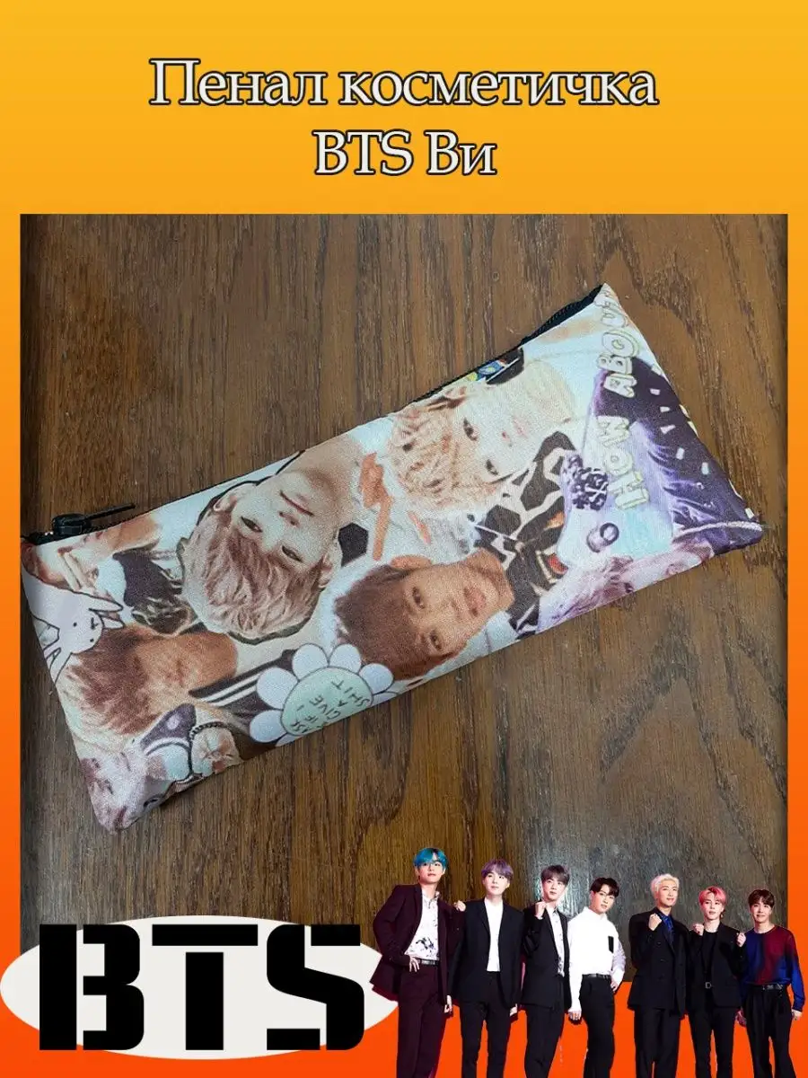 Пенал школьный с большой молнией и с одним вместительным отделением. Изображение с K-pop группой БТС (BTS). Принт яркий и четкий, устойчивый к выцветанию и стирке.