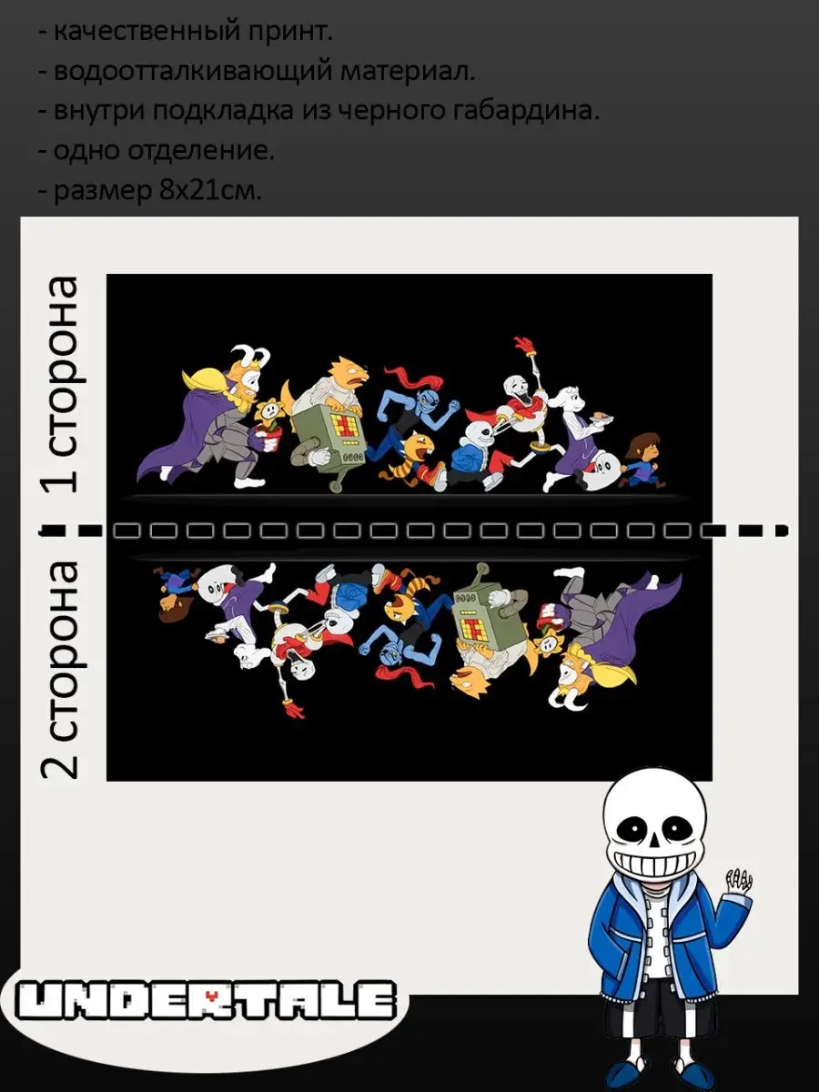Пенал школьный с большой молнией и с одним вместительным отделением. Изображение из игры Андертейл (Undertale). Принт яркий и четкий, устойчивый к выцветанию и стирке.