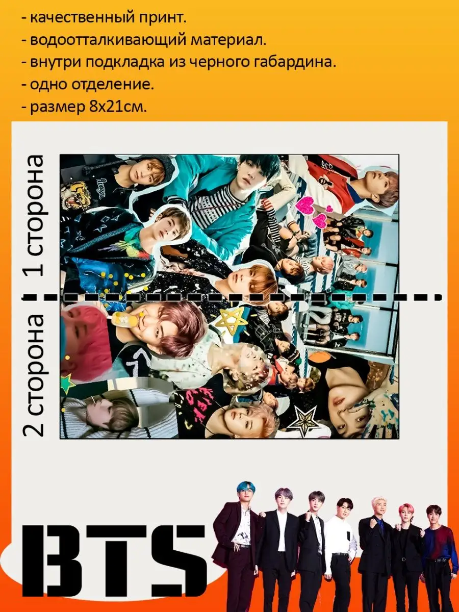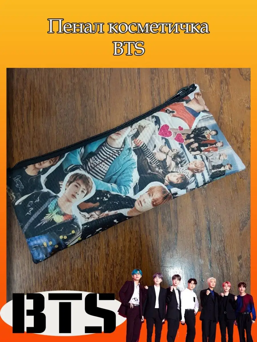 Пенал школьный с большой молнией и с одним вместительным отделением. Изображение с K-pop группой БТС (BTS). Принт яркий и четкий, устойчивый к выцветанию и стирке.