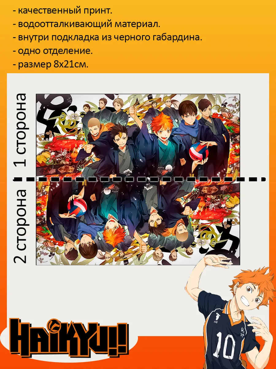Пенал школьный с большой молнией и с одним вместительным отделением. Изображение из аниме Волейбол (Haikyu!!). Принт яркий и четкий, устойчивый к выцветанию и стирке.