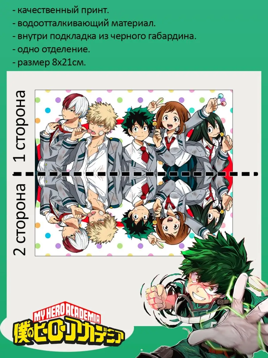 Пенал школьный с большой молнией и с одним вместительным отделением. Изображение из аниме Моя геройская академия (Boku no Hero Academia). Принт яркий и четкий, устойчивый к выцветанию и стирке.