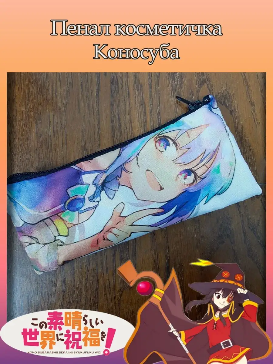 Пенал школьный с большой молнией и с одним вместительным отделением. Изображение из аниме Коносуба: Богиня благословляет этот прекрасный мир! (KonoSuba). Принт яркий и четкий, устойчивый к выцветанию и стирке.