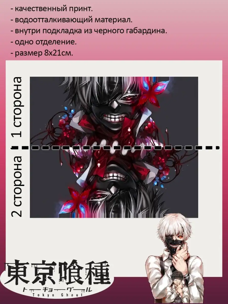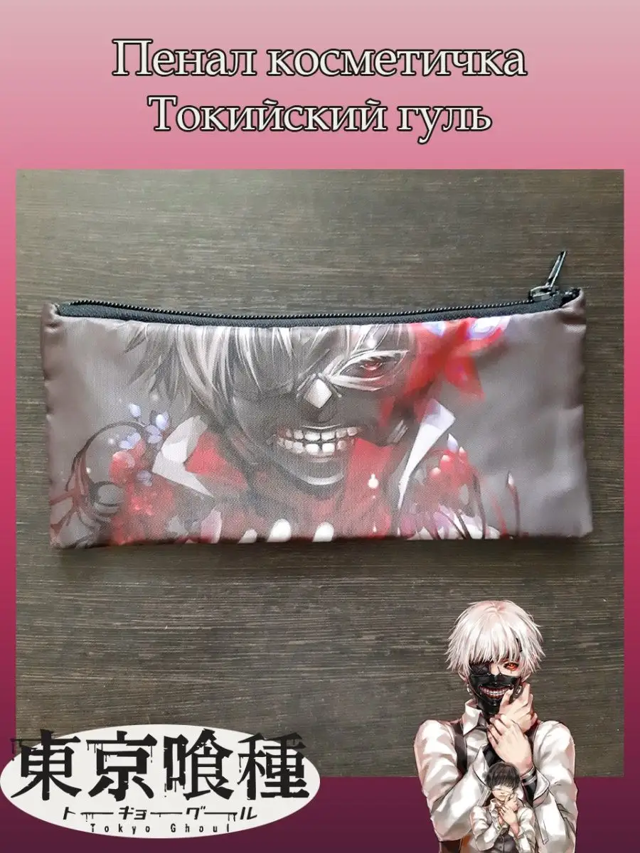 Пенал школьный с большой молнией и с одним вместительным отделением. Изображение из аниме Токийский гуль (Tokyo Ghoul). Принт яркий и четкий, устойчивый к выцветанию и стирке.