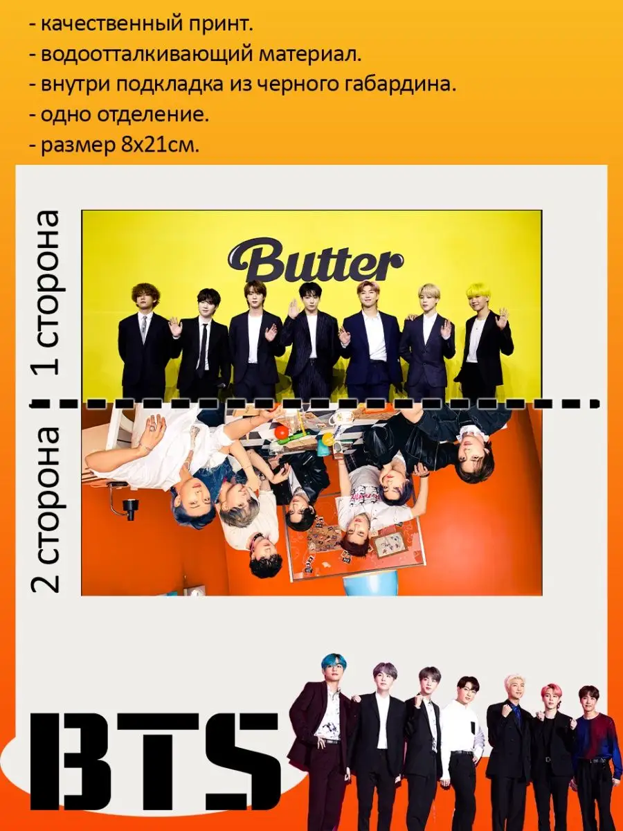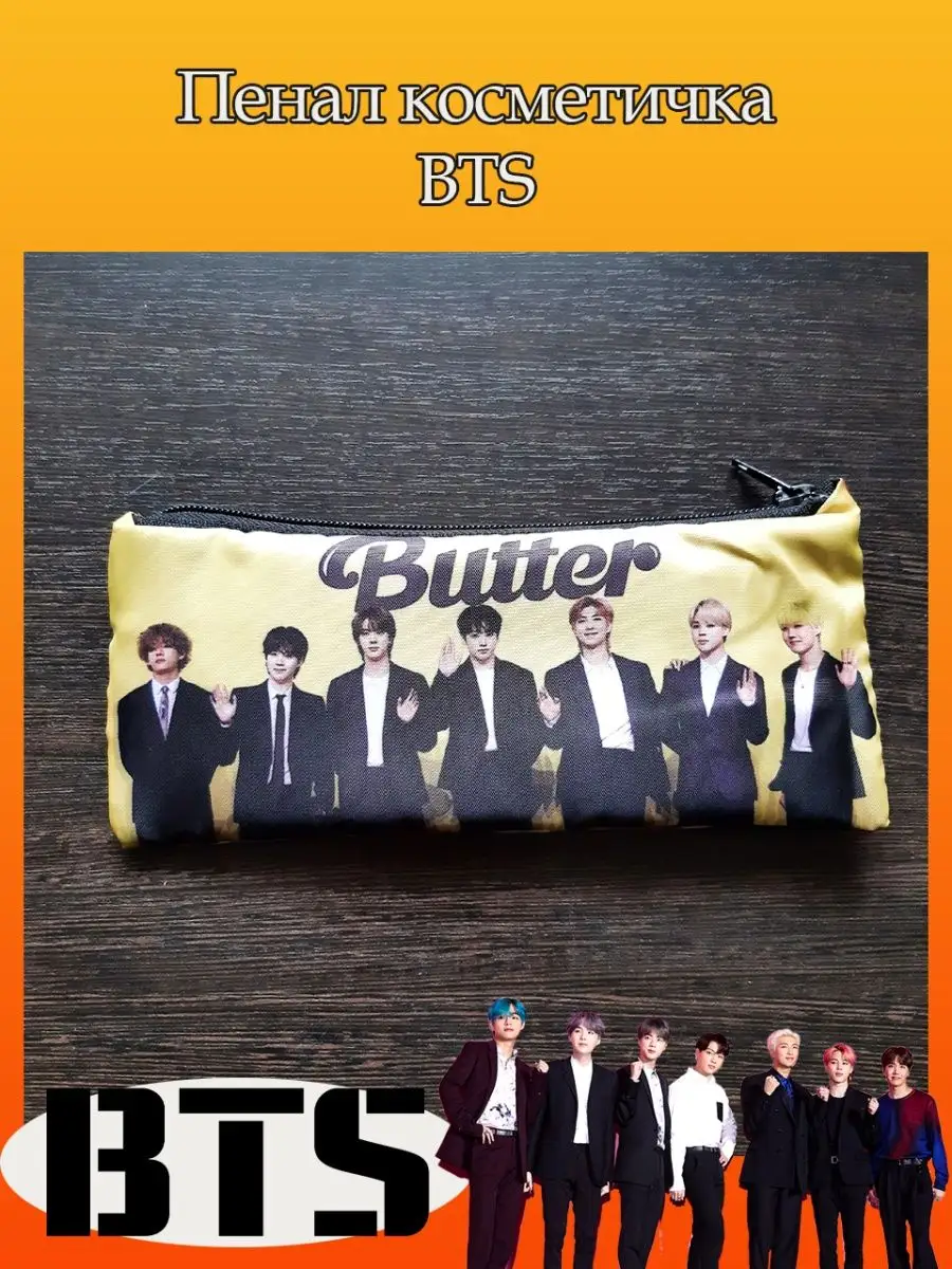 Пенал школьный с большой молнией и с одним вместительным отделением. Изображение с K-pop группой БТС (BTS). Принт яркий и четкий, устойчивый к выцветанию и стирке.