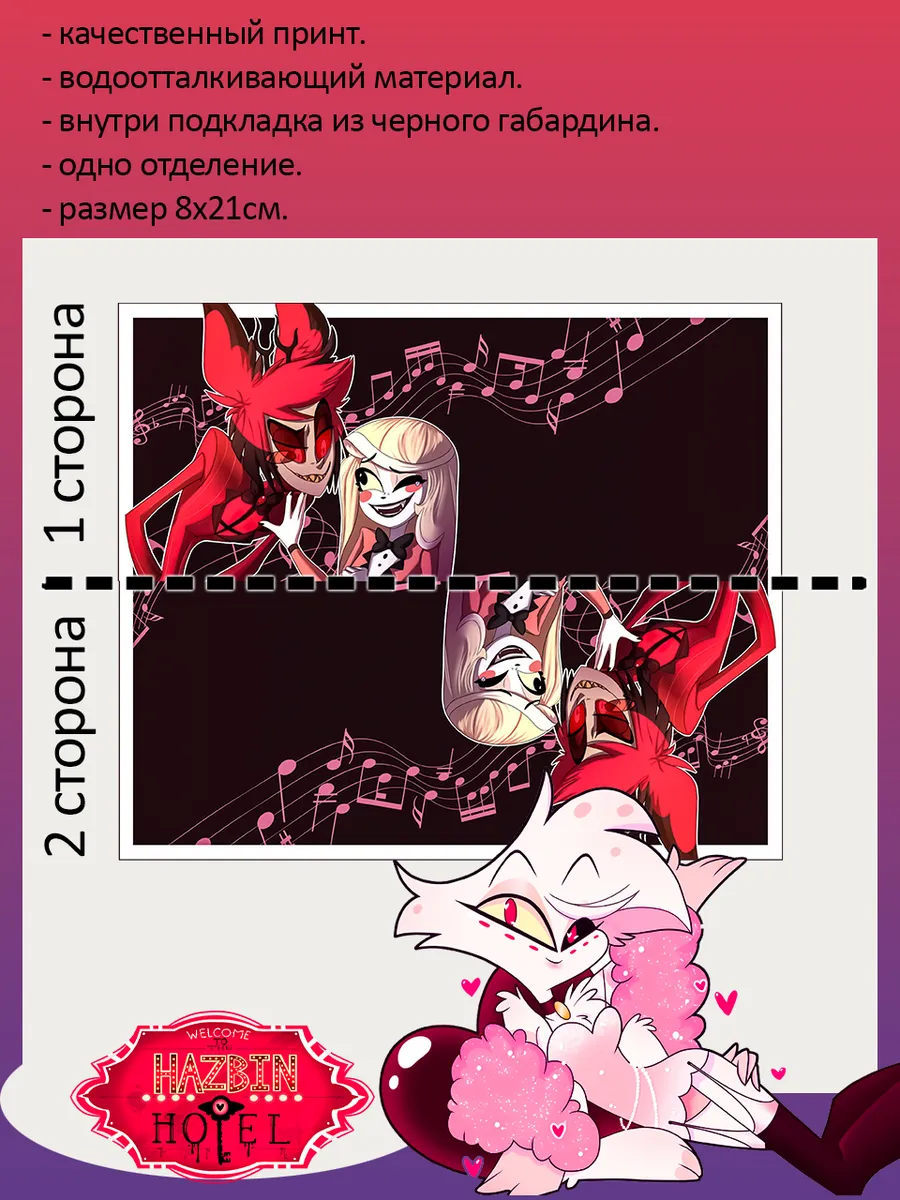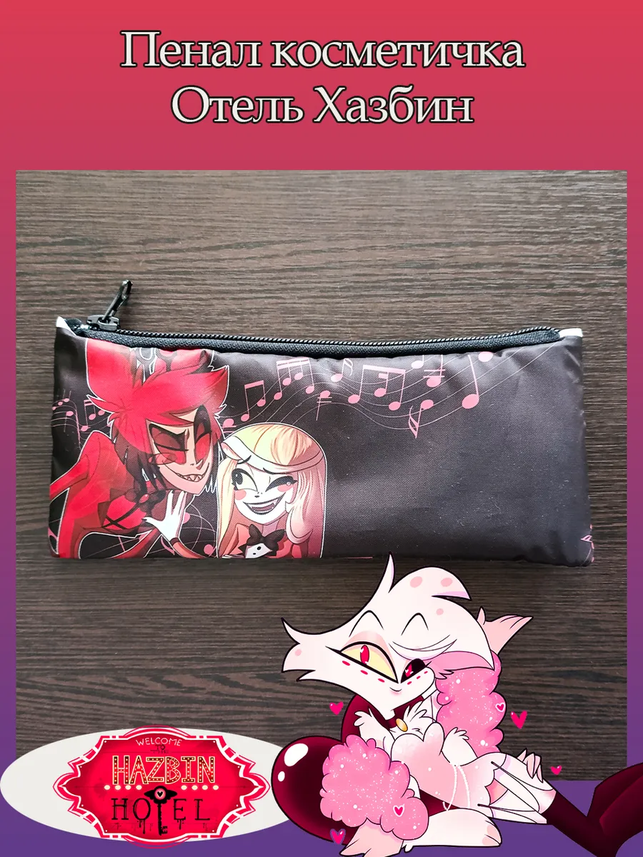 Пенал школьный с большой молнией и с одним вместительным отделением. Изображение из мультсериала Отель Хазбин (Hazbin Hotel). Принт яркий и четкий, устойчивый к выцветанию и стирке.