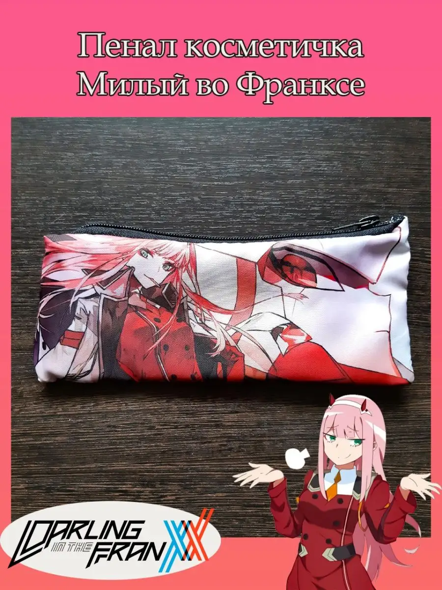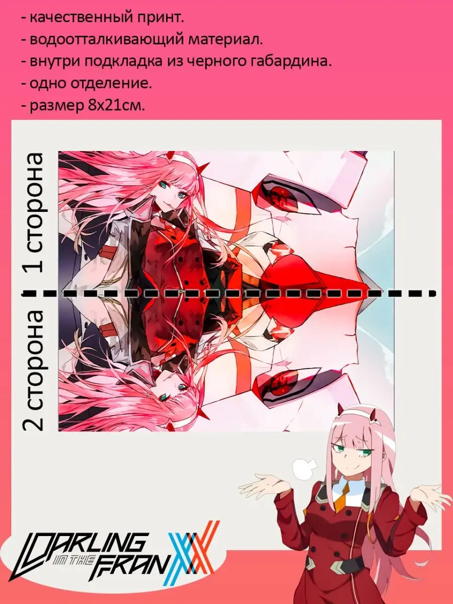 Пенал школьный с большой молнией и с одним вместительным отделением. Изображение из аниме Милый во Франксе (Darling in the Franxx). Принт яркий и четкий, устойчивый к выцветанию и стирке.