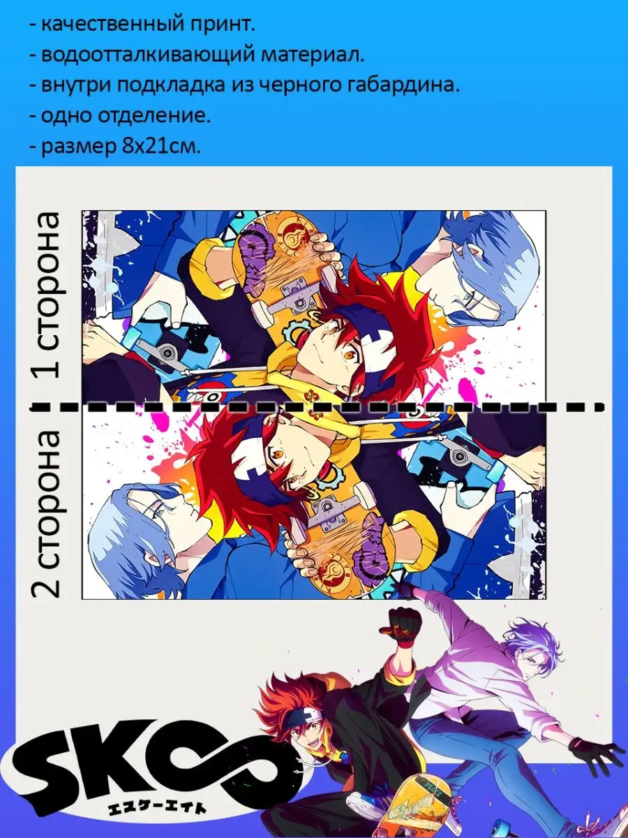 Пенал школьный с большой молнией и с одним вместительным отделением. Изображение из аниме СК8: Скейт в бесконечность (SK8 the Infinity). Принт яркий и четкий, устойчивый к выцветанию и стирке.