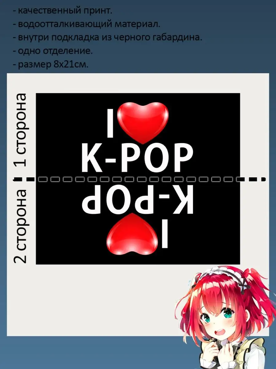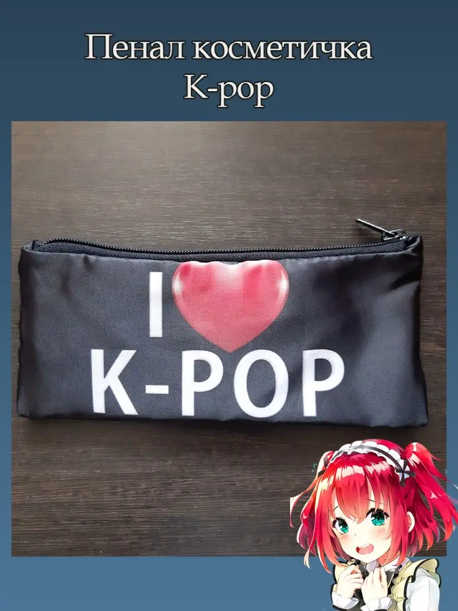 Пенал школьный с большой молнией и с одним вместительным отделением. Изображение Я люблю К-поп (I love K-pop). Принт яркий и четкий, устойчивый к выцветанию и стирке.