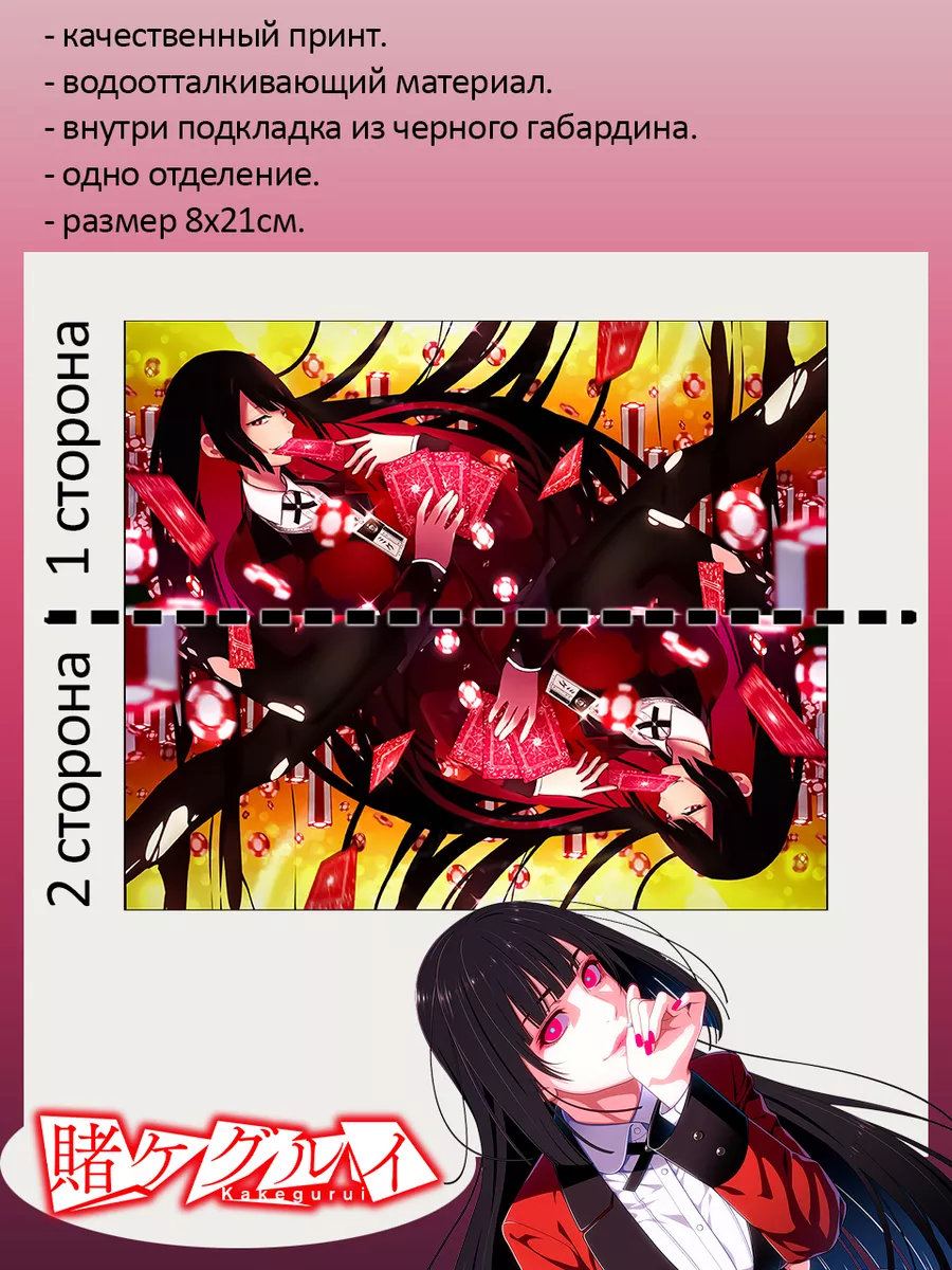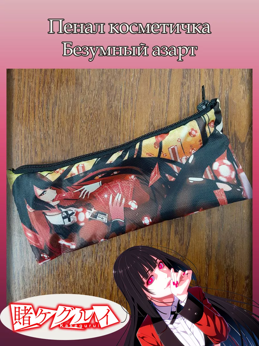 Пенал школьный с большой молнией и с одним вместительным отделением. Изображение из аниме Безумный азарт (Kakegurui). Принт яркий и четкий, устойчивый к выцветанию и стирке.