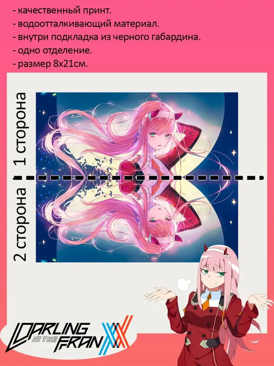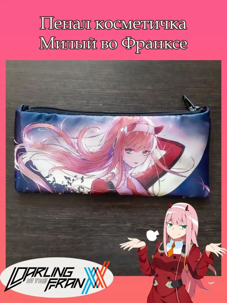 Пенал школьный с большой молнией и с одним вместительным отделением. Изображение из аниме Милый во Франксе (Darling in the Franxx). Принт яркий и четкий, устойчивый к выцветанию и стирке.