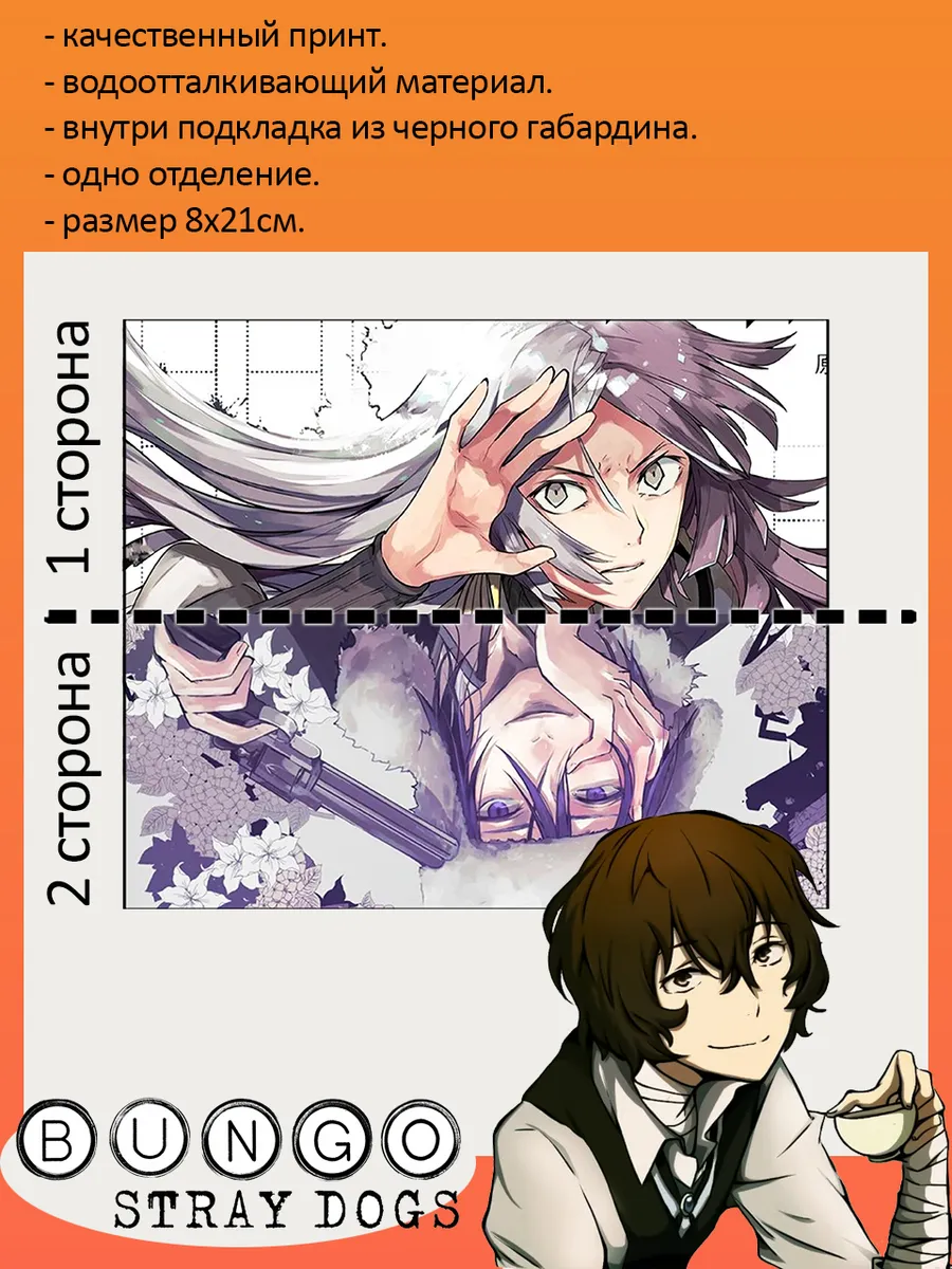 Пенал школьный с большой молнией и с одним вместительным отделением. Изображение из аниме Великий из бродячих псов (Bungo Stray Dogs). Принт яркий и четкий, устойчивый к выцветанию и стирке.