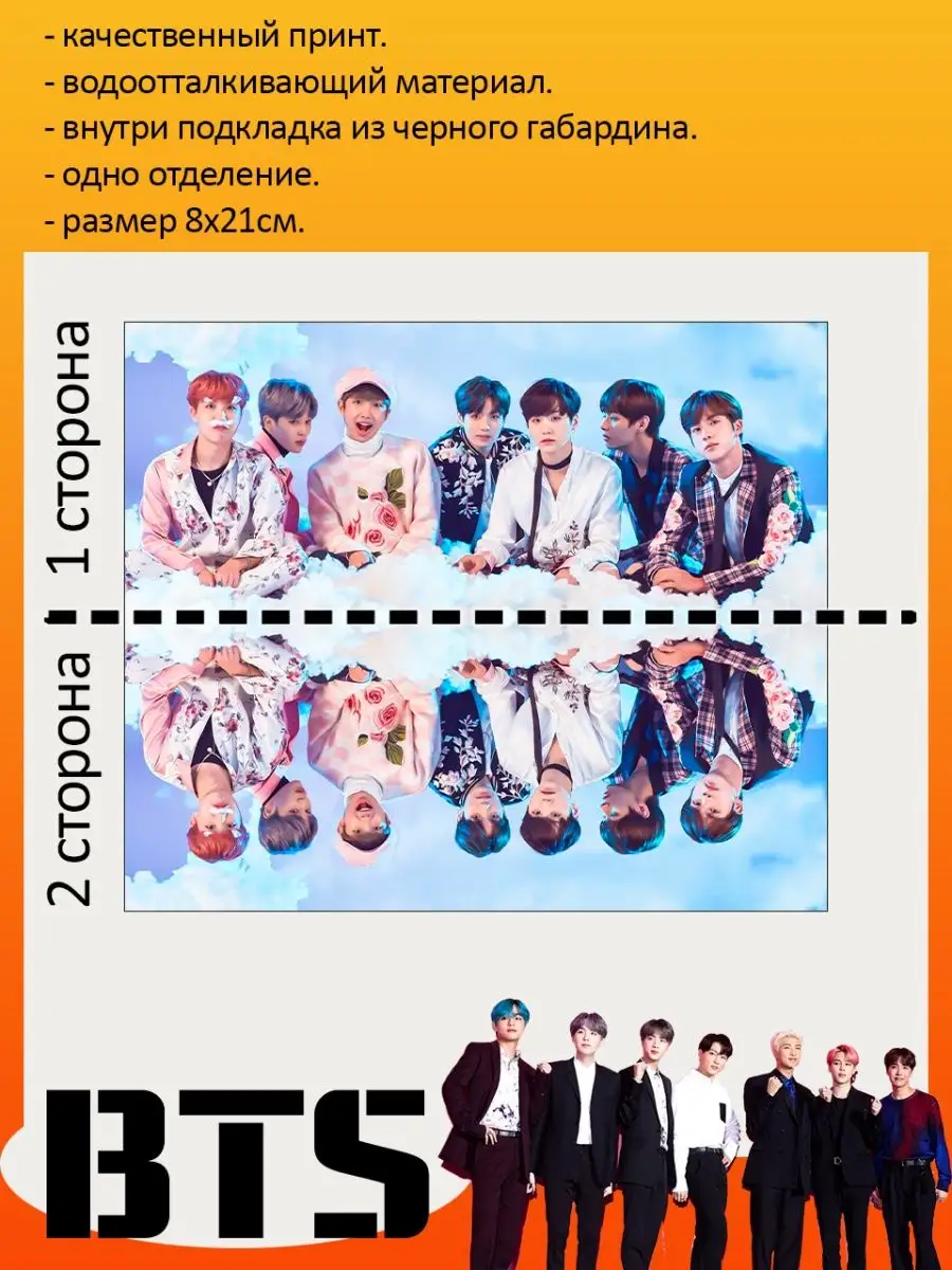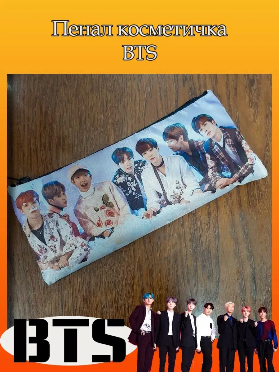 Пенал школьный с большой молнией и с одним вместительным отделением. Изображение с K-pop группой БТС (BTS). Принт яркий и четкий, устойчивый к выцветанию и стирке.