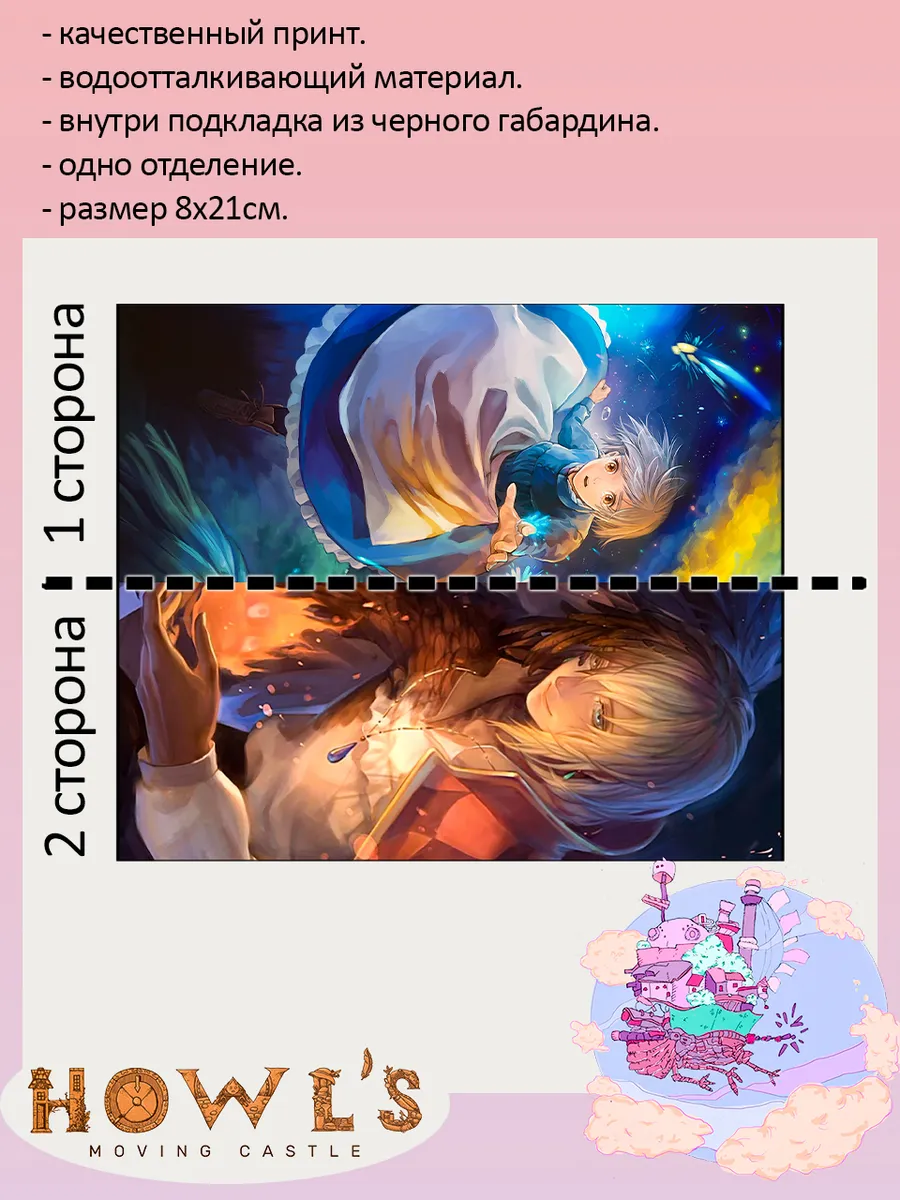Пенал школьный с большой молнией и с одним вместительным отделением. Изображение из аниме Ходячий замок (Howl's Moving Castle). Принт яркий и четкий, устойчивый к выцветанию и стирке.