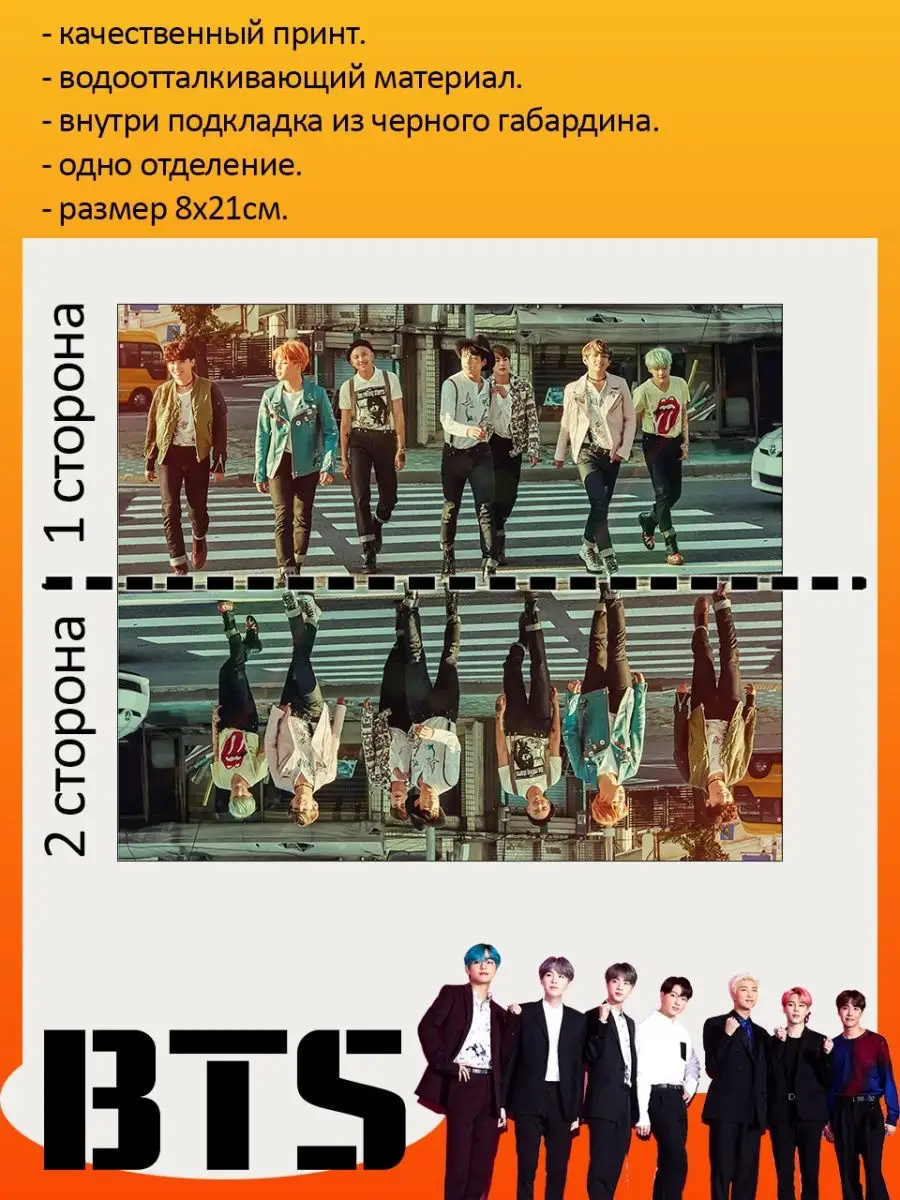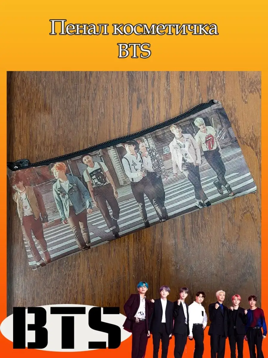Пенал школьный с большой молнией и с одним вместительным отделением. Изображение с K-pop группой БТС (BTS). Принт яркий и четкий, устойчивый к выцветанию и стирке.