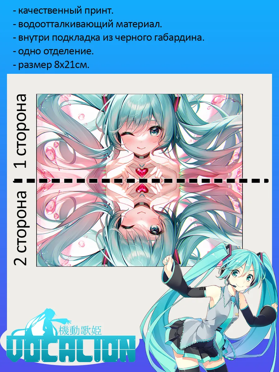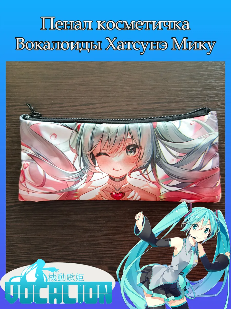 Пенал школьный с большой молнией и с одним вместительным отделением. Изображение из вокалоидов Хатсунэ Мику (Miku Hatsune). Принт яркий и четкий, устойчивый к выцветанию и стирке.
