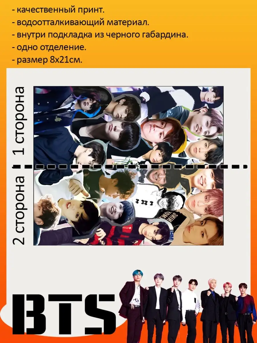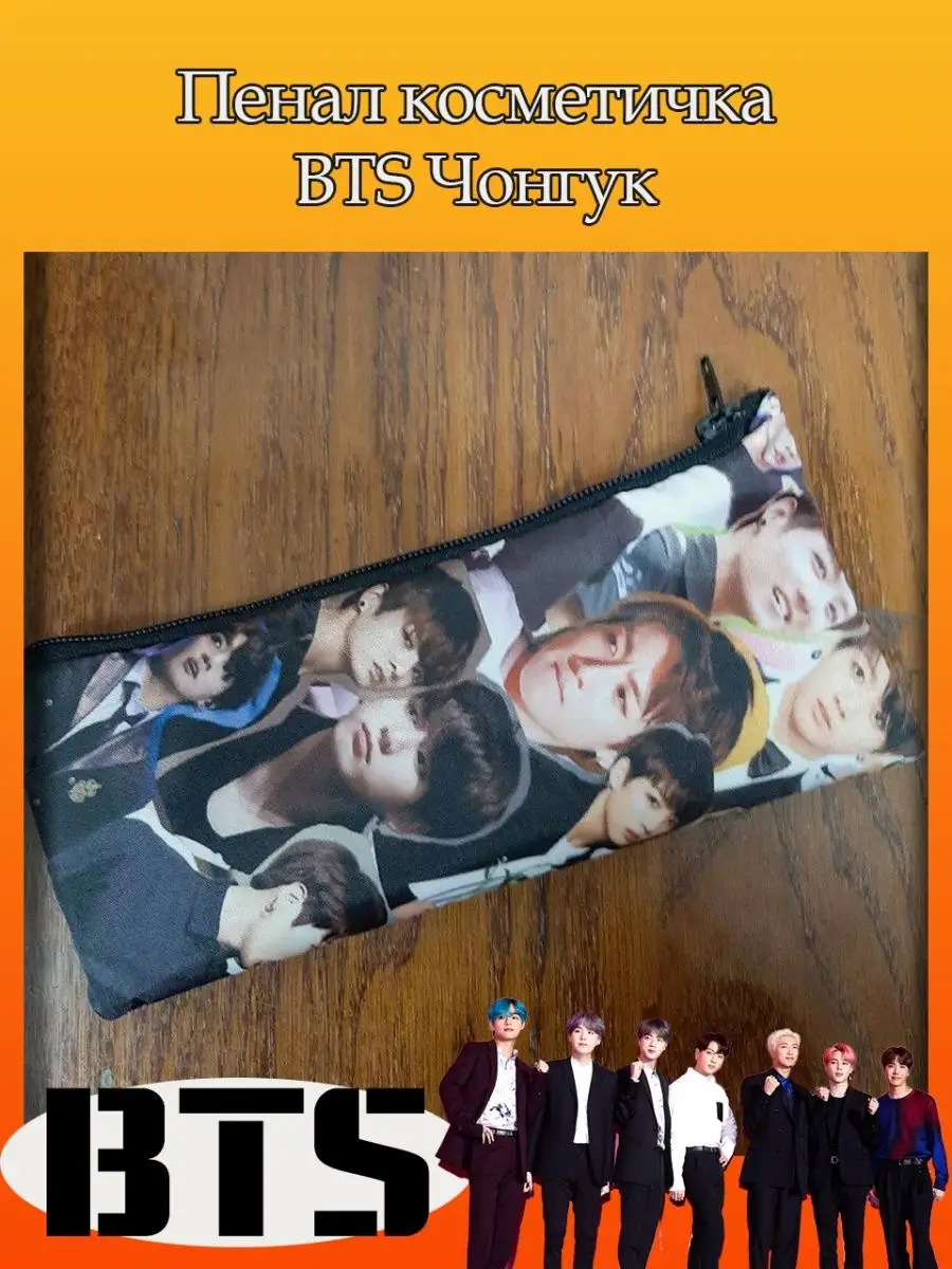 Пенал школьный с большой молнией и с одним вместительным отделением. Изображение с K-pop группой БТС (BTS). Принт яркий и четкий, устойчивый к выцветанию и стирке.