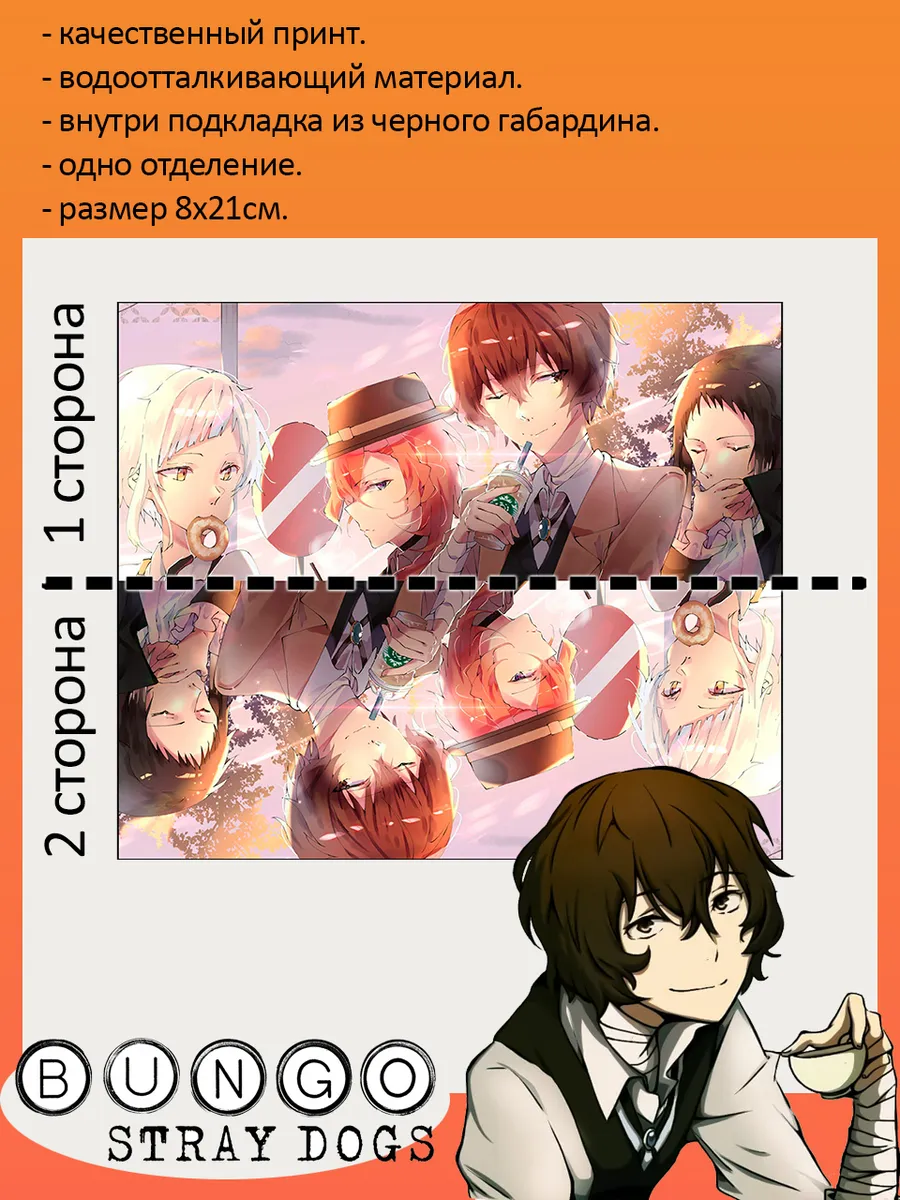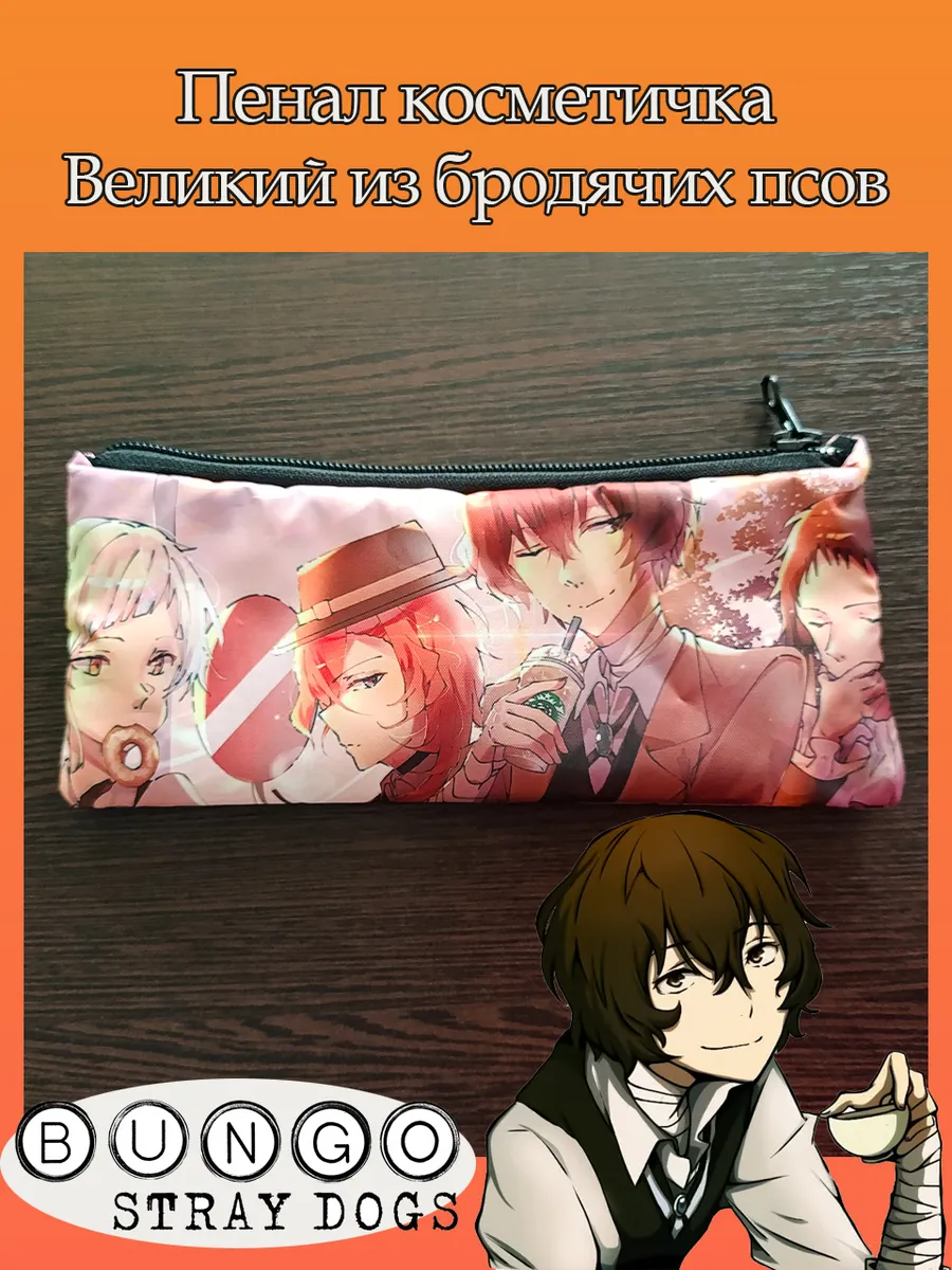 Пенал школьный с большой молнией и с одним вместительным отделением. Изображение из аниме Великий из бродячих псов (Bungo Stray Dogs). Принт яркий и четкий, устойчивый к выцветанию и стирке.