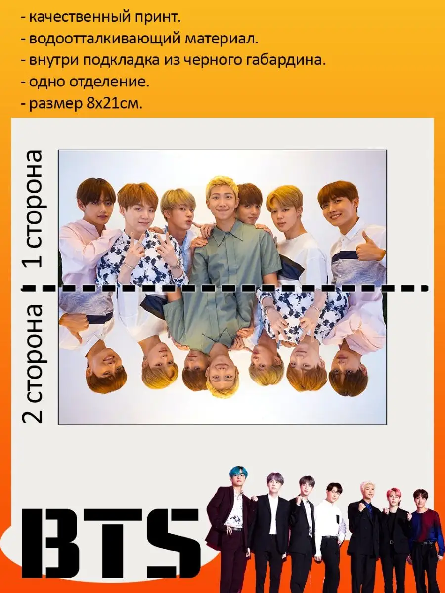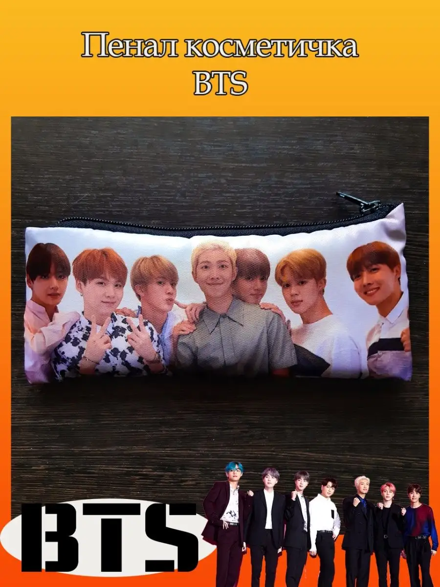 Пенал школьный с большой молнией и с одним вместительным отделением. Изображение с K-pop группой БТС (BTS). Принт яркий и четкий, устойчивый к выцветанию и стирке.