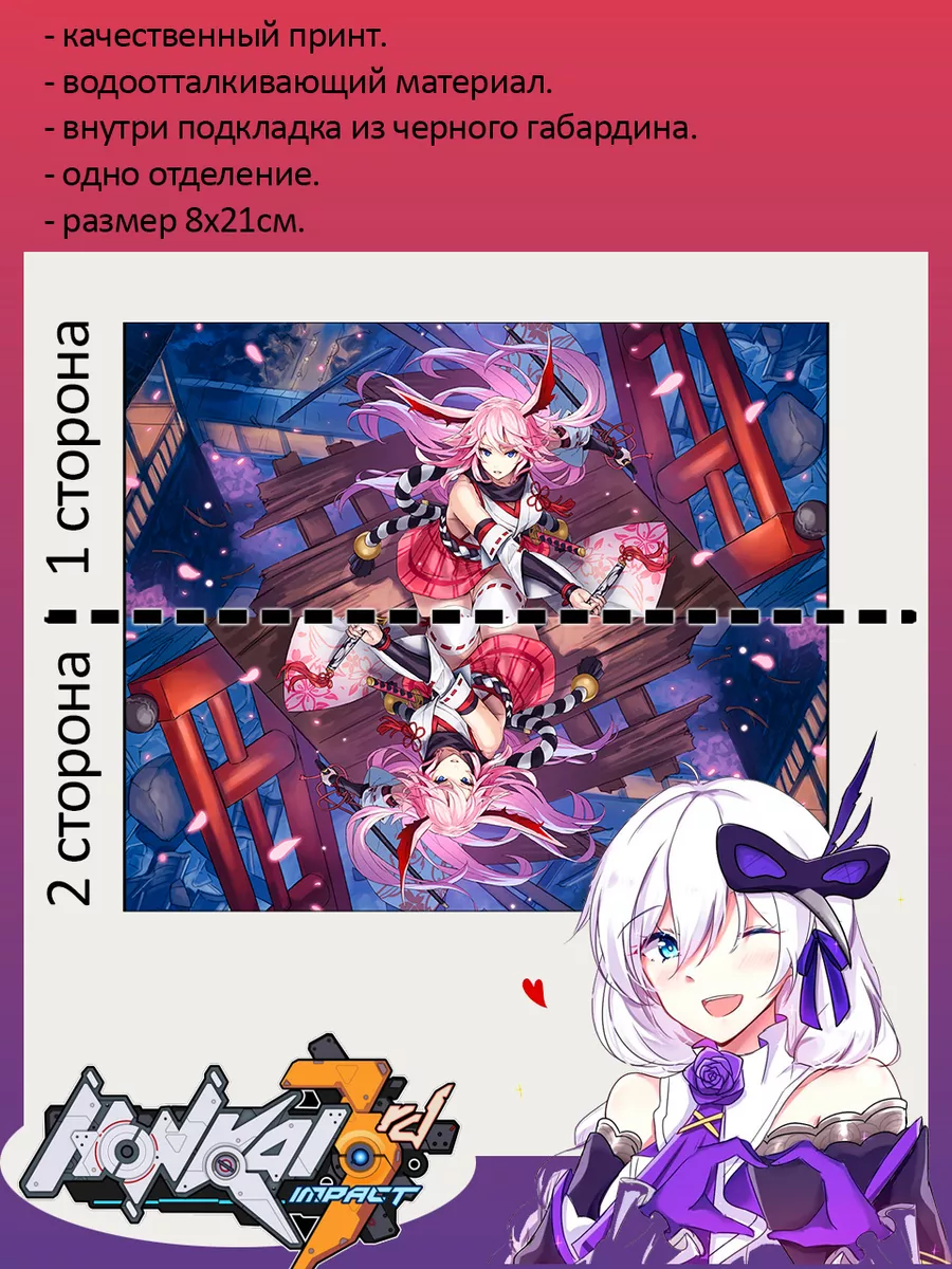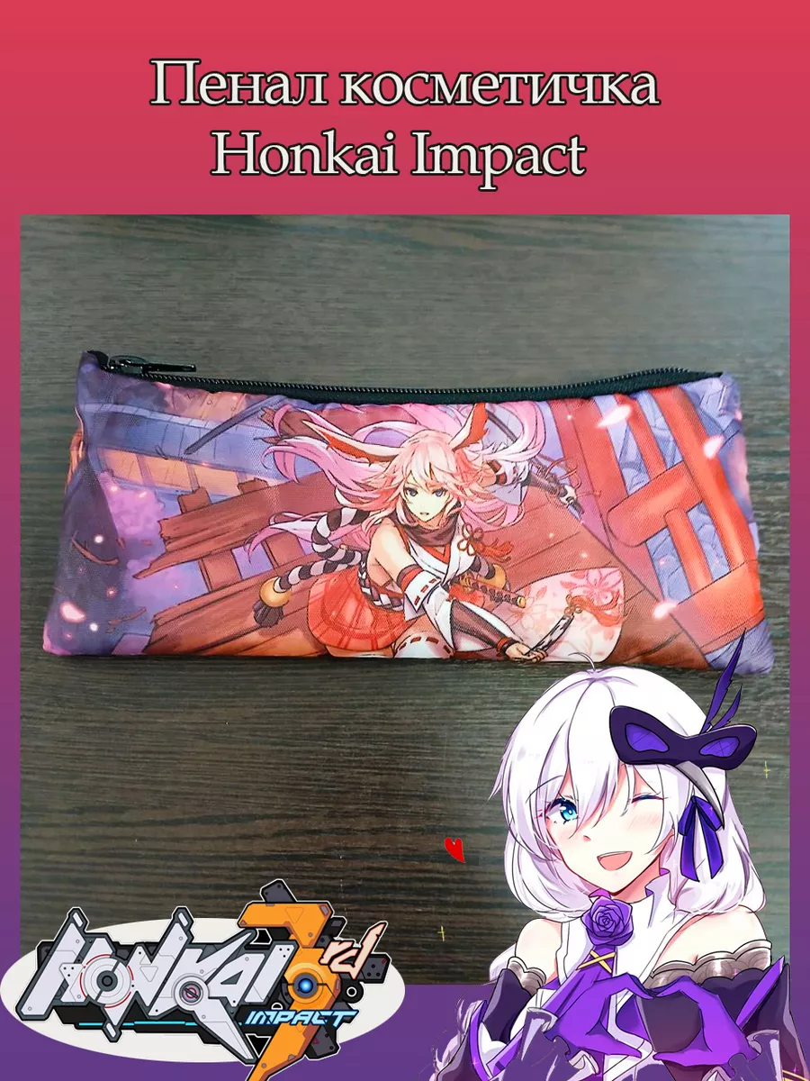 Пенал школьный с большой молнией и с одним вместительным отделением. Изображение из компьютерная игра Хонкай Импакт (Honkai Impact). Принт яркий и четкий, устойчивый к выцветанию и стирке.