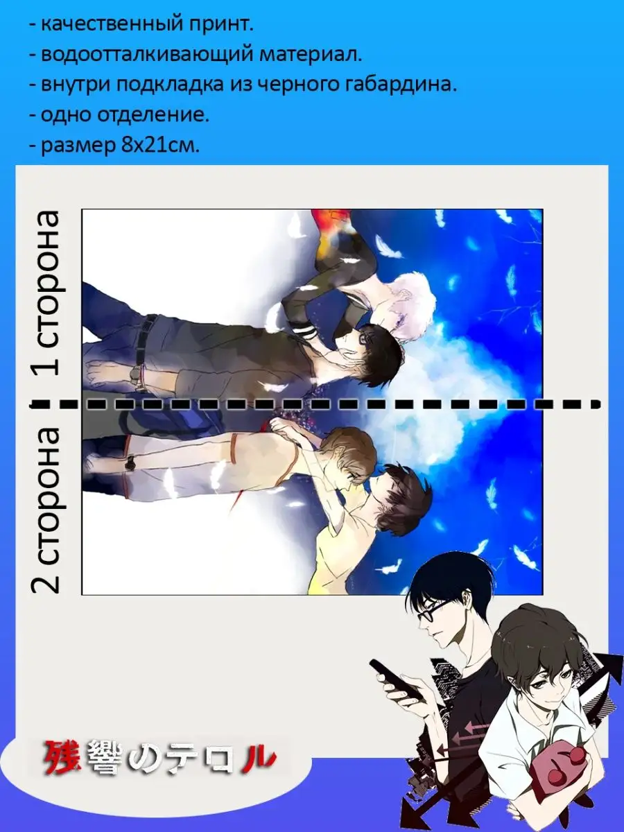 Пенал школьный с большой молнией и с одним вместительным отделением. Изображение из аниме Эхо террора (Zankyou no Terror). Принт яркий и четкий, устойчивый к выцветанию и стирке.
