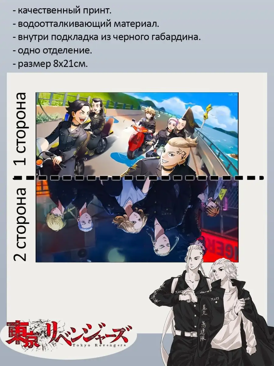 Пенал школьный с большой молнией и с одним вместительным отделением. Изображение из аниме Токийские мстители (Tokyo Revengers). Принт яркий и четкий, устойчивый к выцветанию и стирке.
