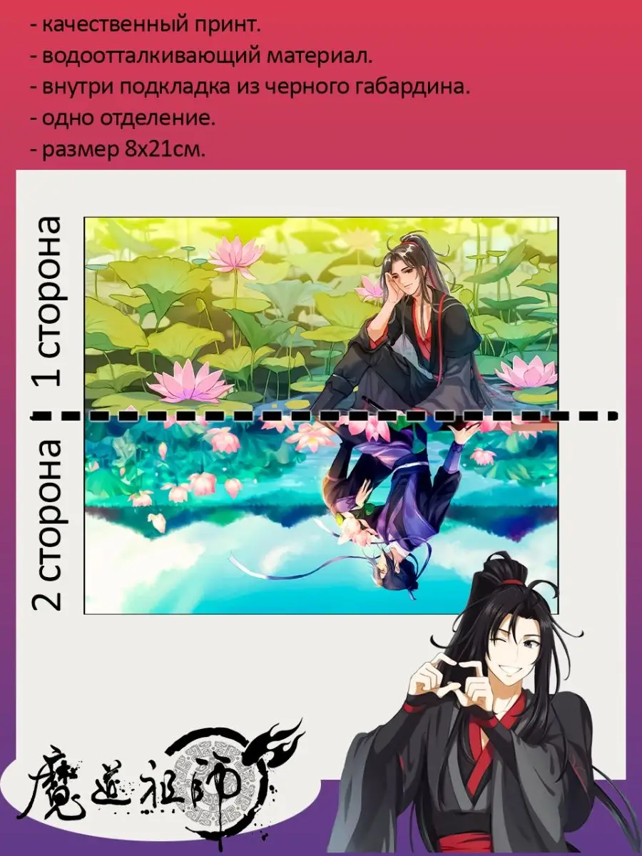 Пенал школьный с большой молнией и с одним вместительным отделением. Изображение из аниме Магистр дьявольского культа (Mo Dao Zu Shi). Принт яркий и четкий, устойчивый к выцветанию и стирке.