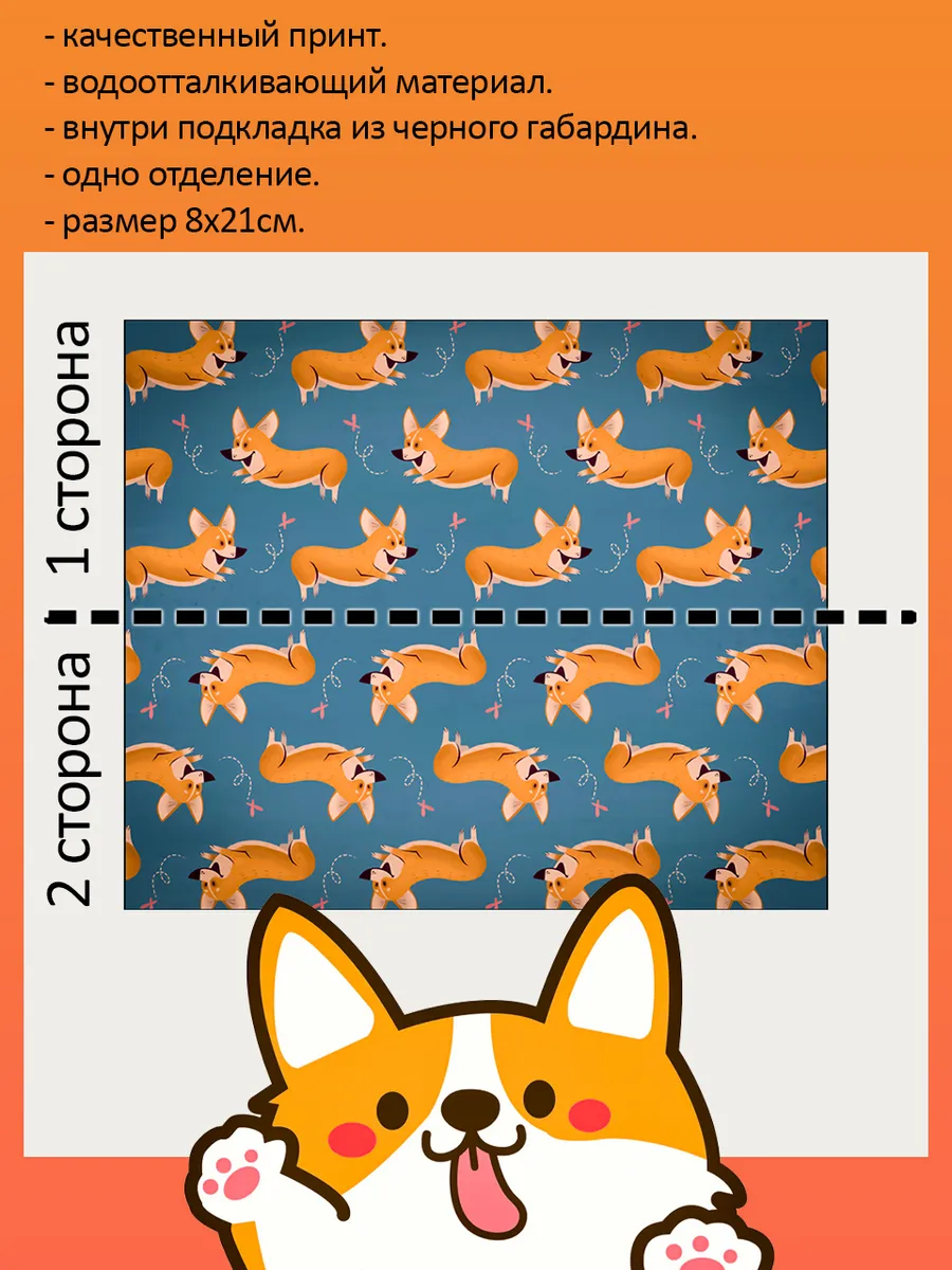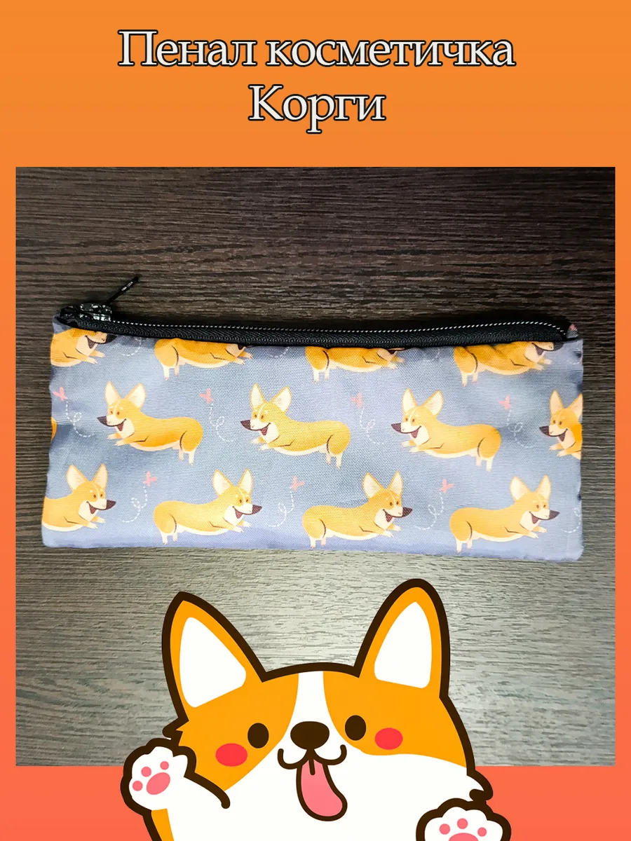 Пенал школьный с большой молнией и с одним вместительным отделением. Изображение Вельш-Корги. Принт яркий и четкий, устойчивый к выцветанию и стирке.