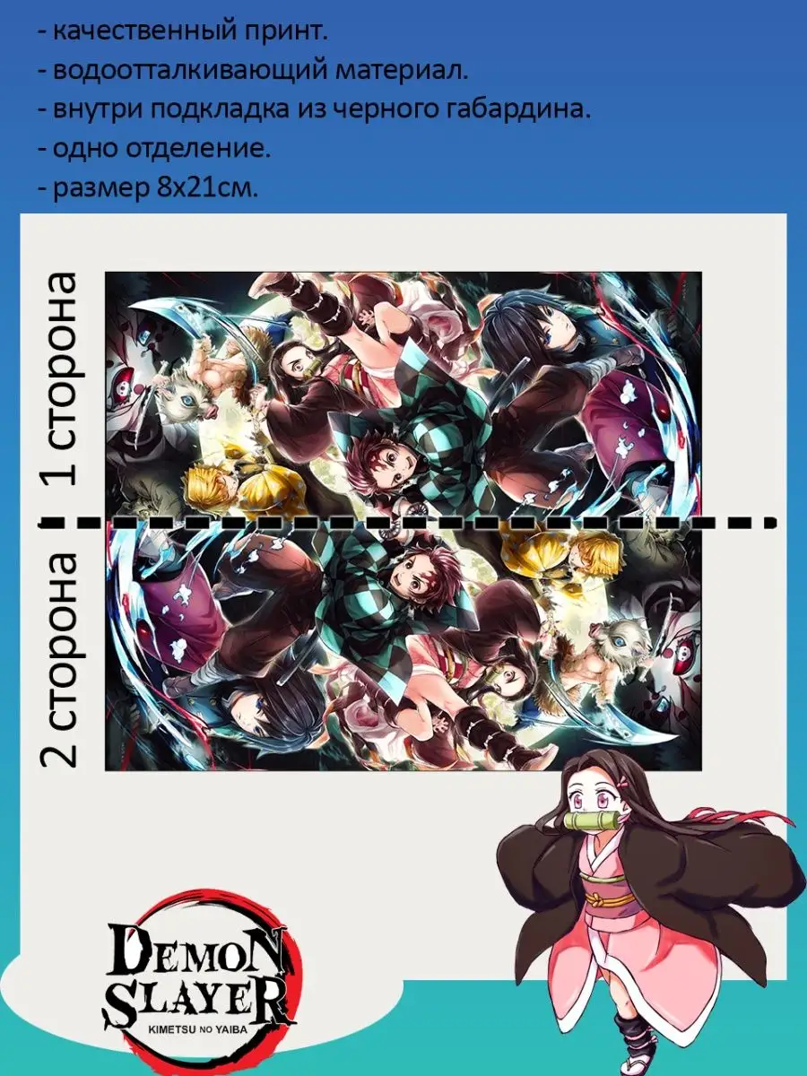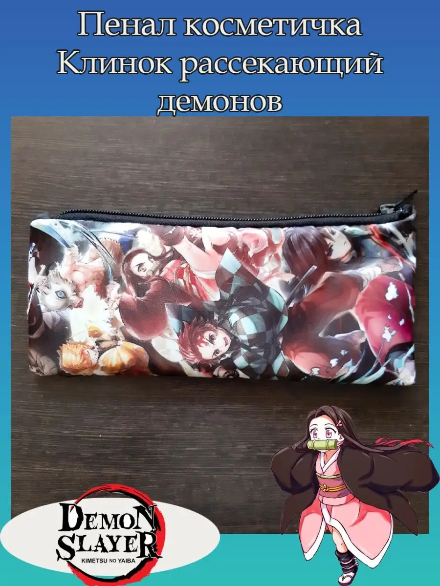 Пенал школьный с большой молнией и с одним вместительным отделением. Изображение из аниме Клинок рассекающий демонов (Demon Slayer: Kimetsu no Yaiba). Принт яркий и четкий, устойчивый к выцветанию и стирке.