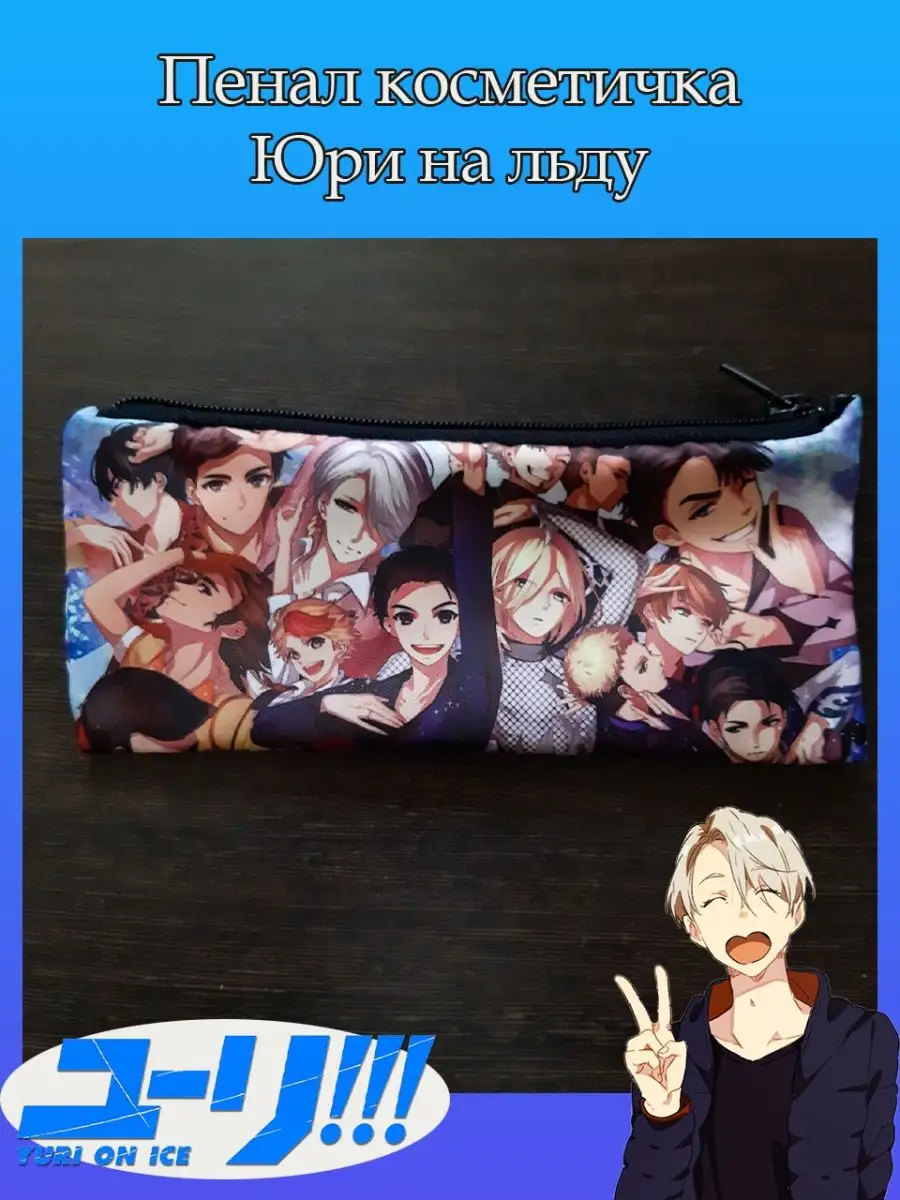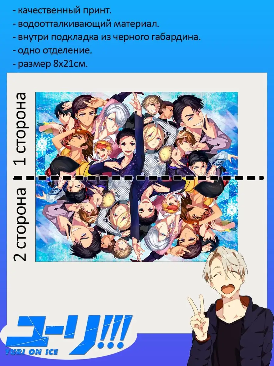 Пенал школьный с большой молнией и с одним вместительным отделением. Изображение из аниме Юри на льду (Yuri!!! On Ice). Принт яркий и четкий, устойчивый к выцветанию и стирке.