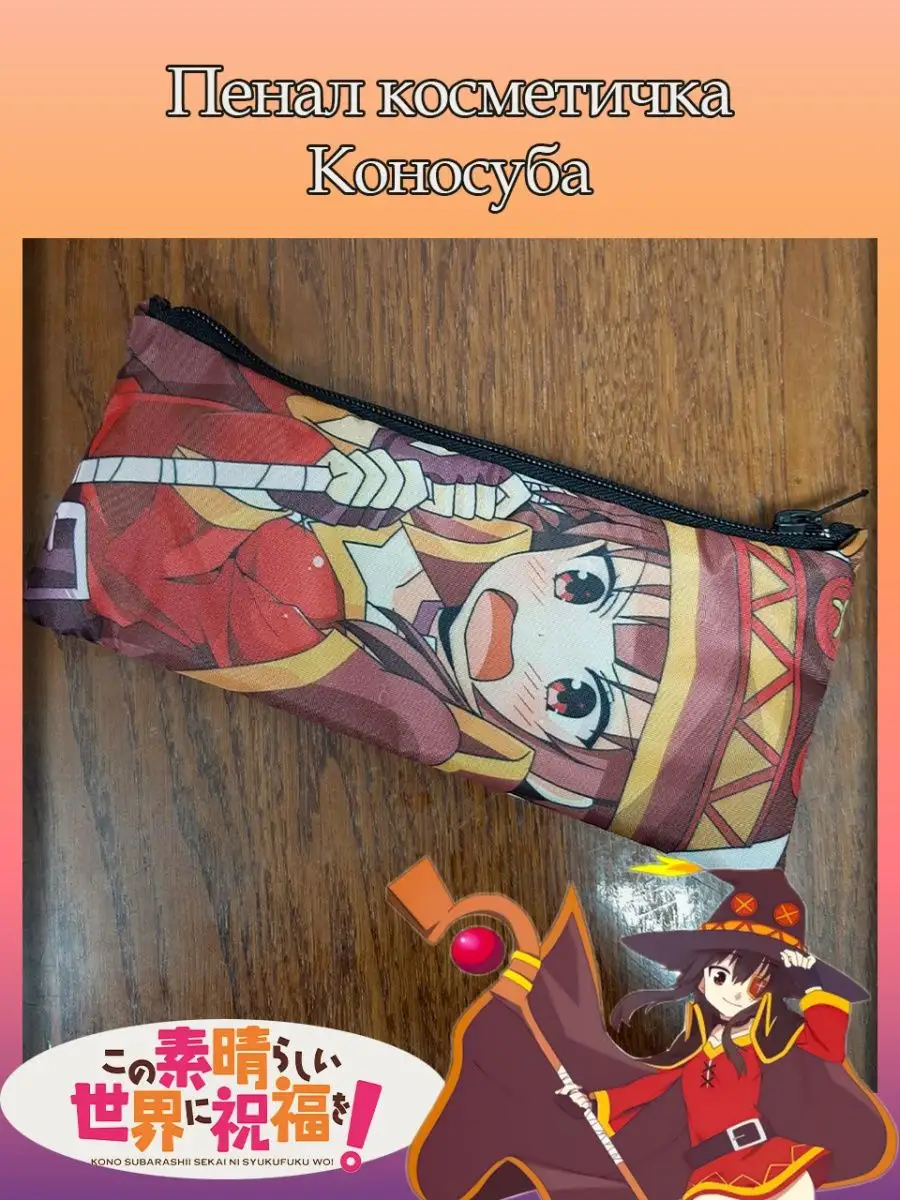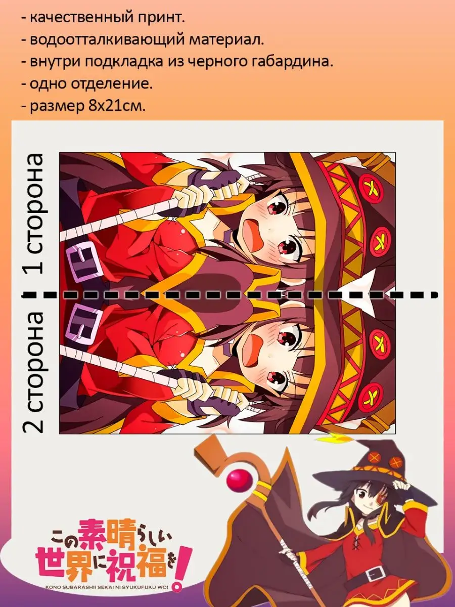 Пенал школьный с большой молнией и с одним вместительным отделением. Изображение из аниме Коносуба: Богиня благословляет этот замечательный мир (KonoSuba). Принт яркий и четкий, устойчивый к выцветанию и стирке.