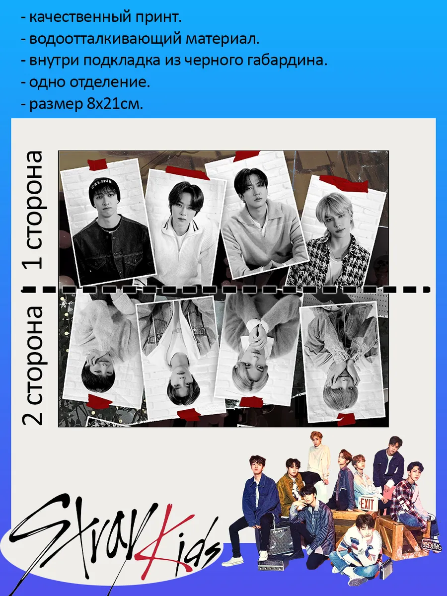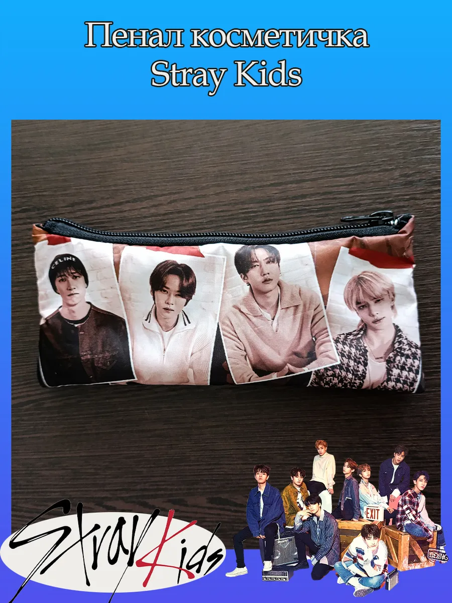 Пенал школьный с большой молнией и с одним вместительным отделением. Изображение с К-поп группой Стрэй Кидс ( Stray Kids ). Принт яркий и четкий, устойчивый к выцветанию и стирке.