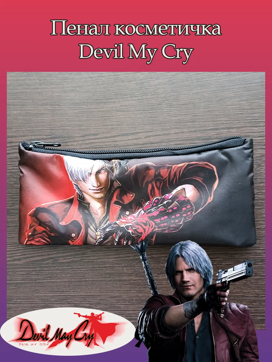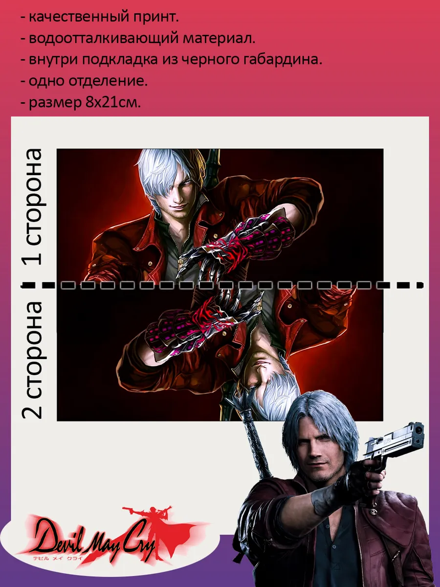 Пенал школьный с большой молнией и с одним вместительным отделением. Изображение из игры Девил Май Край (Devil May Cry). Принт яркий и четкий, устойчивый к выцветанию и стирке.