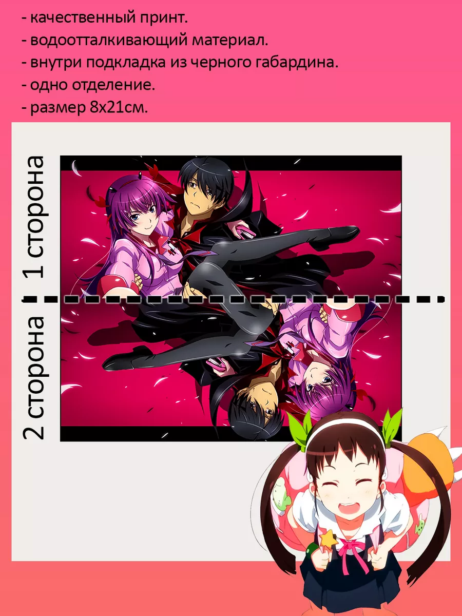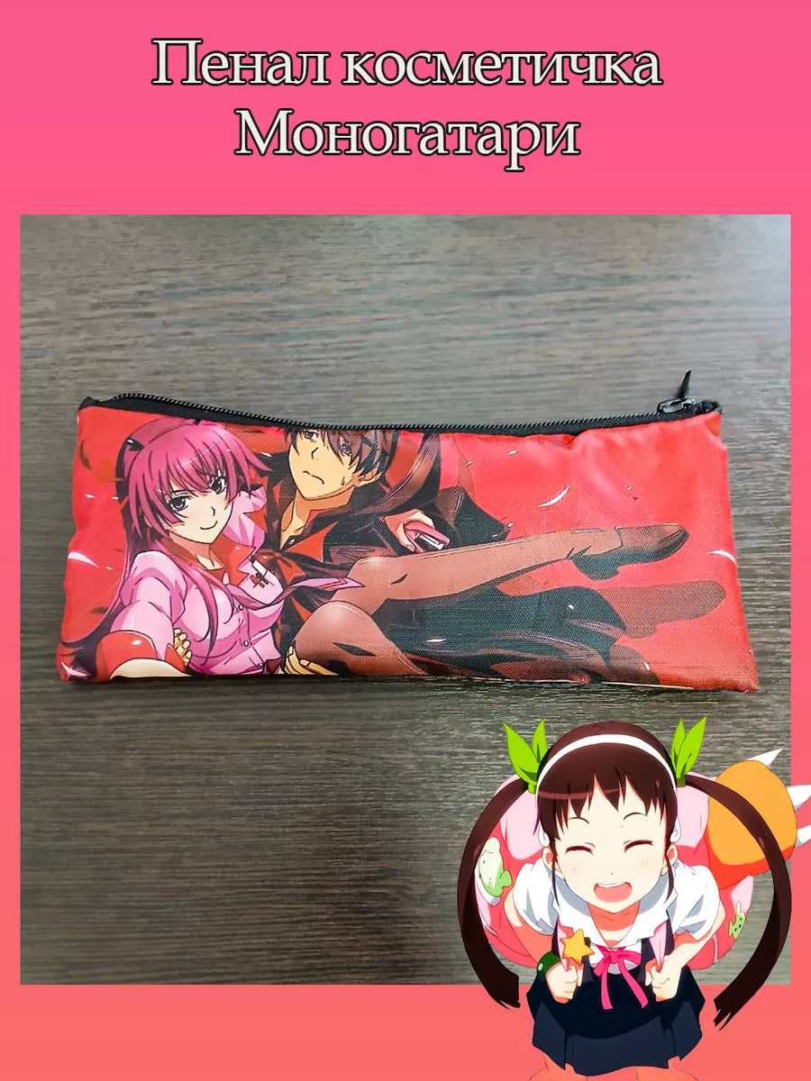 Пенал школьный с большой молнией и с одним вместительным отделением. Изображение из аниме Моногатари Истории Монстров (Monogatari). Принт яркий и четкий, устойчивый к выцветанию и стирке.