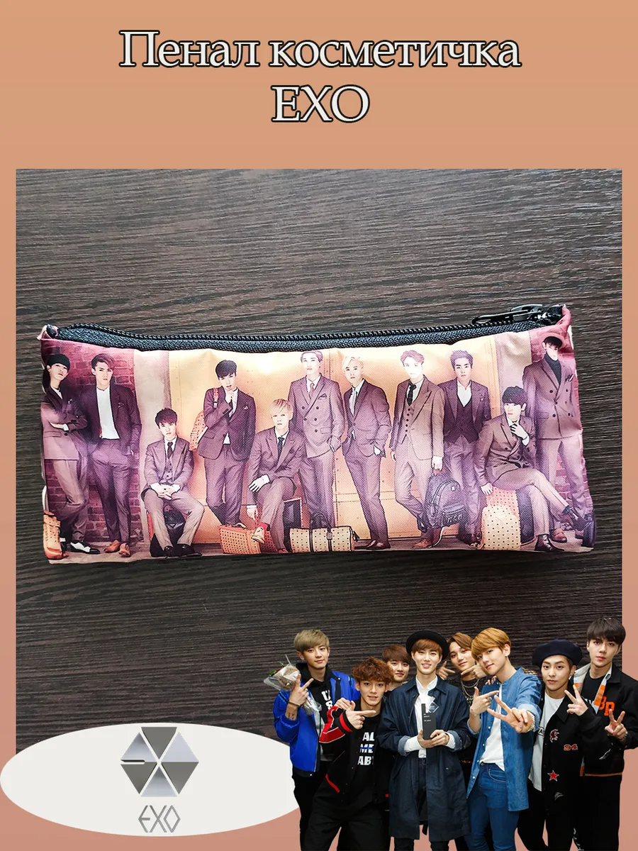 Пенал школьный с большой молнией и с одним вместительным отделением. Изображение с кей поп группой Экзо (Exo). Принт яркий и четкий, устойчивый к выцветанию и стирке.