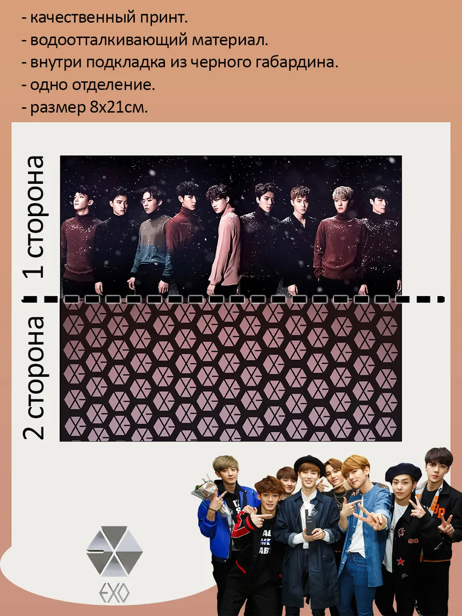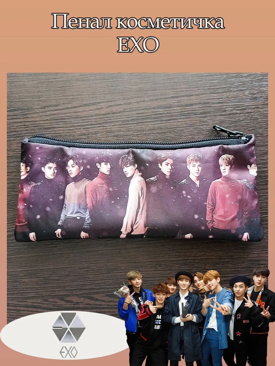 Пенал школьный с большой молнией и с одним вместительным отделением. Изображение с кей поп группой Экзо (Exo). Принт яркий и четкий, устойчивый к выцветанию и стирке.