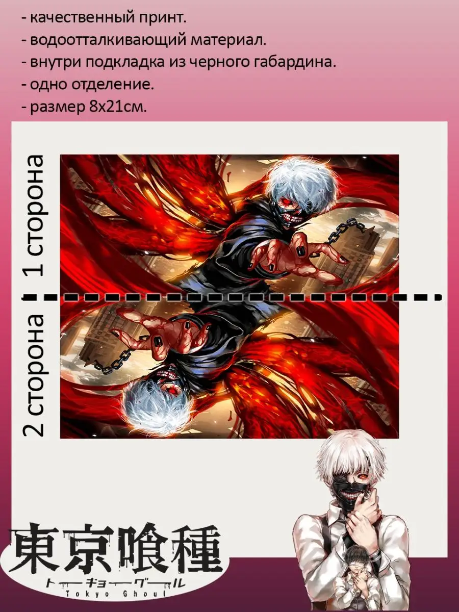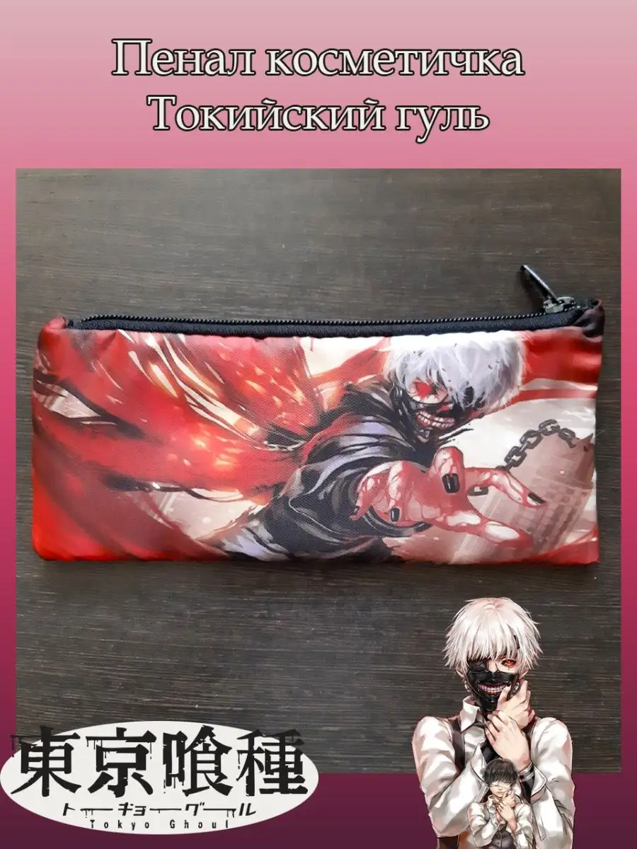 Пенал школьный с большой молнией и с одним вместительным отделением. Изображение из аниме Токийский гуль (Tokyo Ghoul). Принт яркий и четкий, устойчивый к выцветанию и стирке.