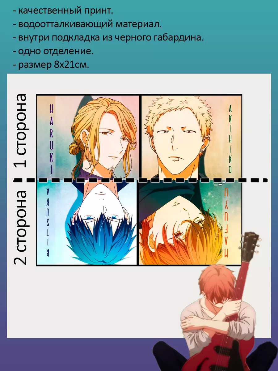 Пенал школьный с большой молнией и с одним вместительным отделением. Изображение из аниме Дарованный (Given). Принт яркий и четкий, устойчивый к выцветанию и стирке.