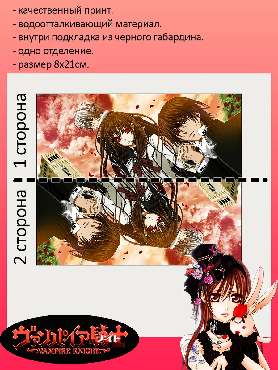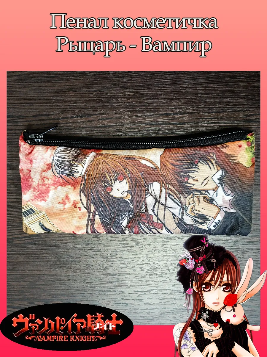 Пенал школьный с большой молнией и с одним вместительным отделением. Изображение из аниме Рыцарь Вампир (Vampire Knight). Принт яркий и четкий, устойчивый к выцветанию и стирке.