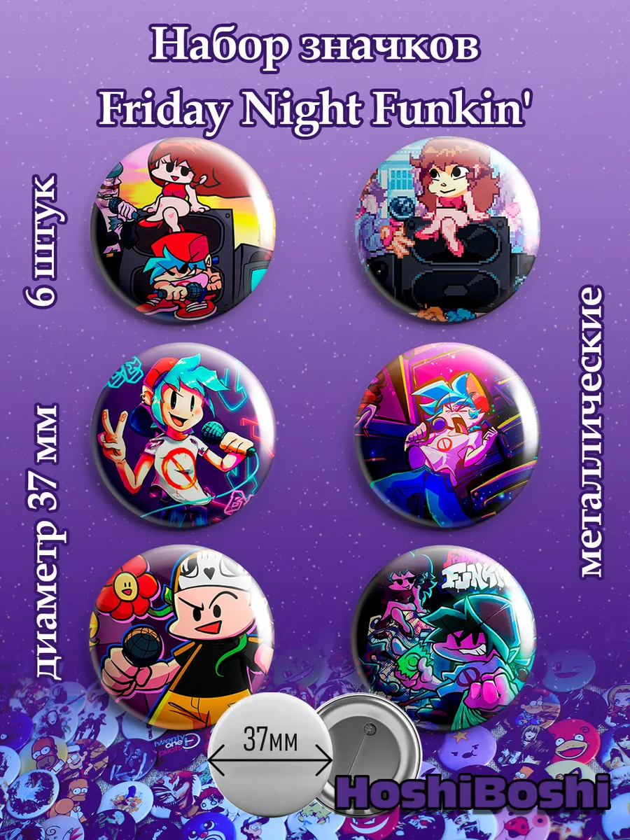 Набор из 6 металлических значков с изображениями из игры Фридэй Найт Фанки ( Friday Night Funkin ).