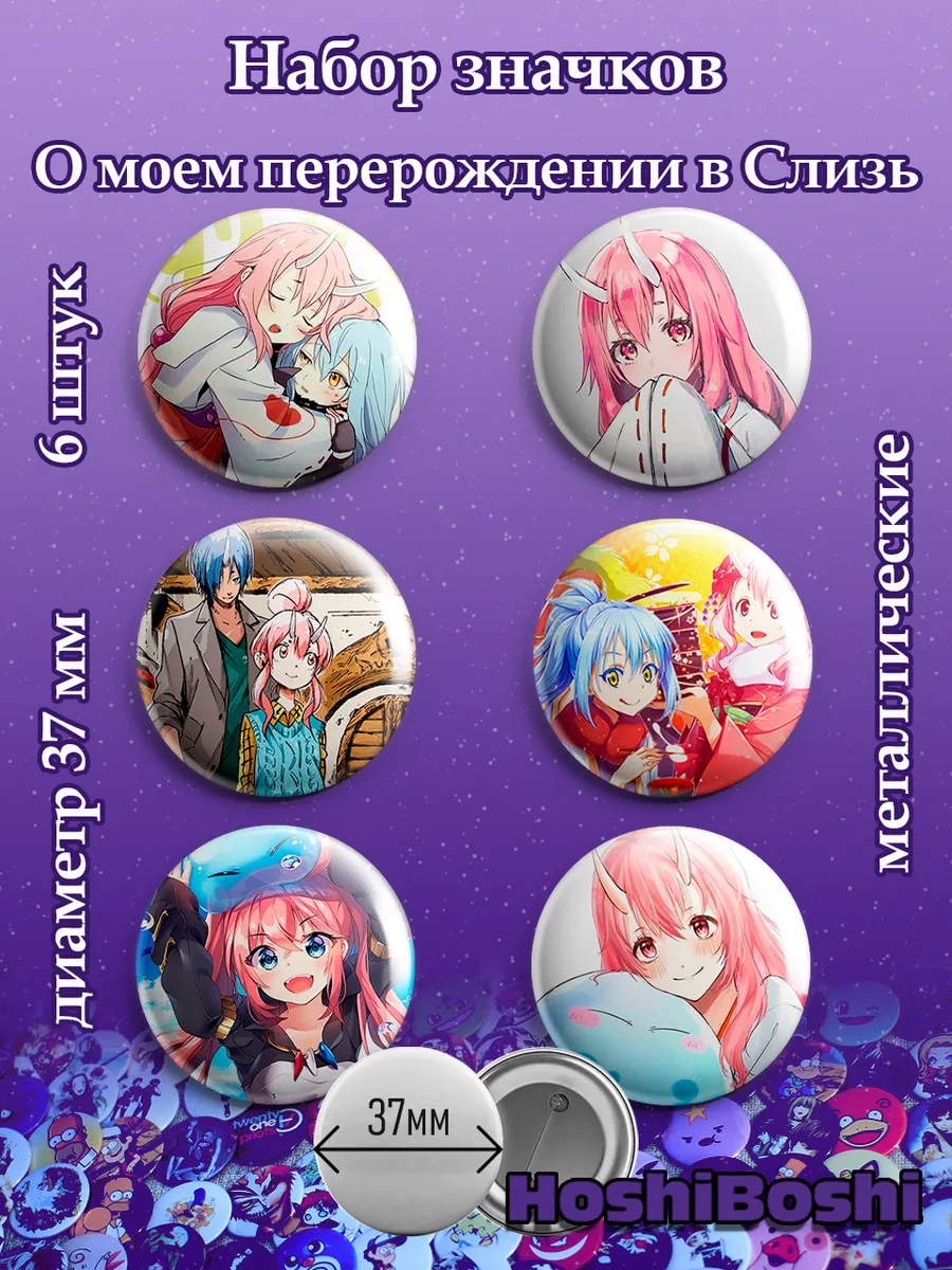 Набор из 6 металлических значков с изображениями из аниме О моем перерождении в слизь ( Tensei shitara Slime Datta Ken ).