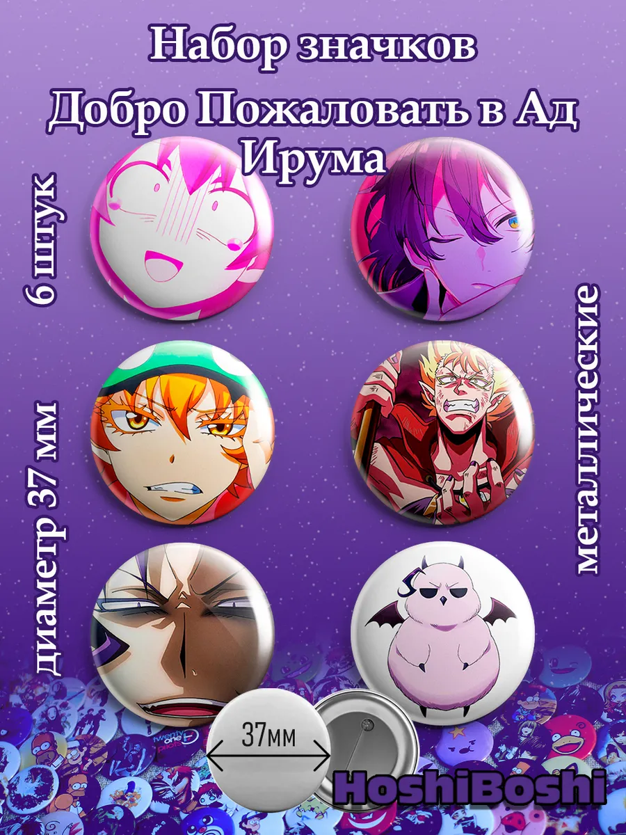 Набор из 6 металлических значков с изображениями из аниме Добро Пожаловпать в Ад Ирума ( Welcome to Demon School! Iruma-kun Mairimashita! Iruma-kun ).