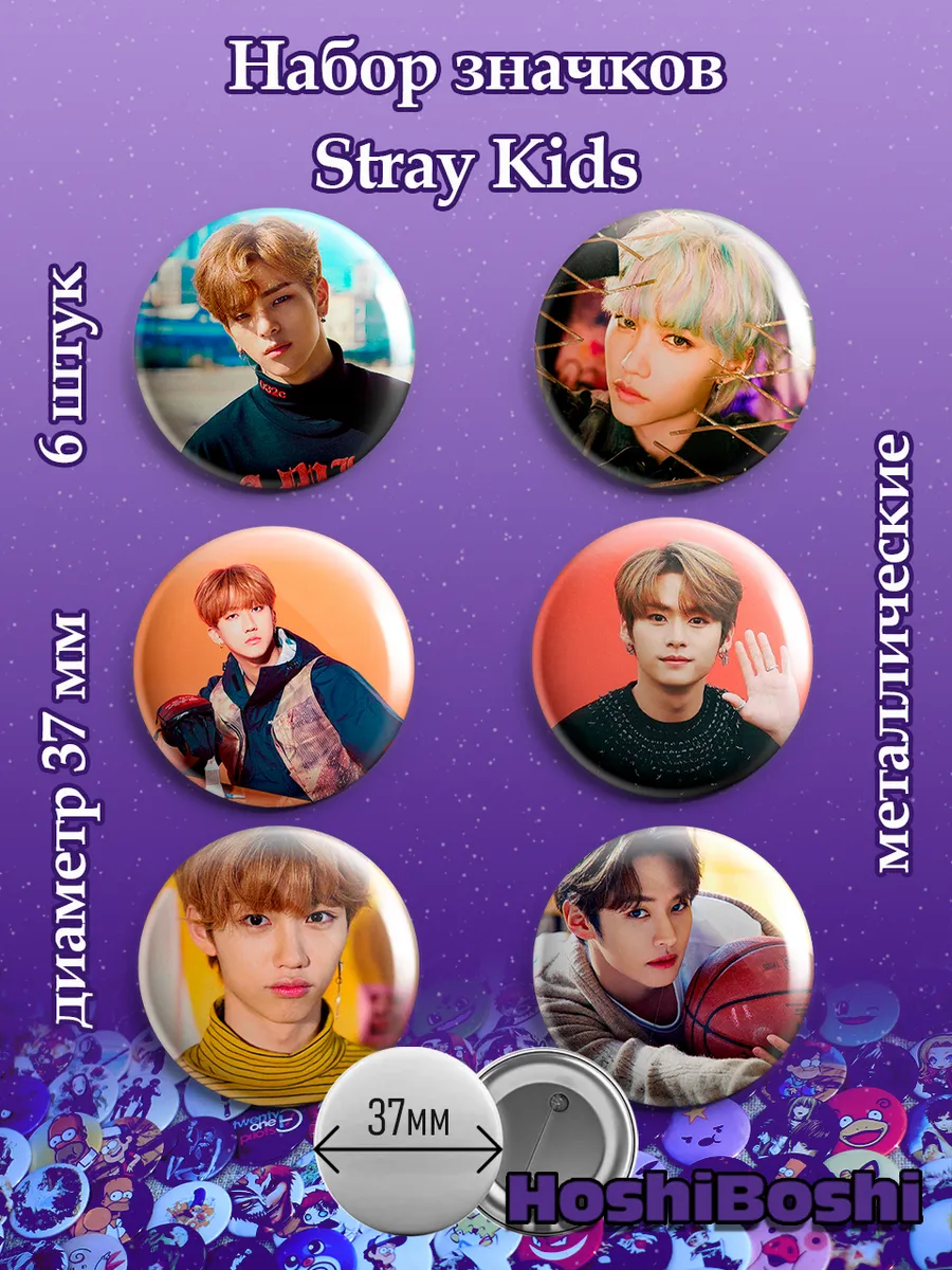 Набор из 6 металлических значков с изображениями Кей-поп группы Стрэй Кидс ( Stray Kids ).